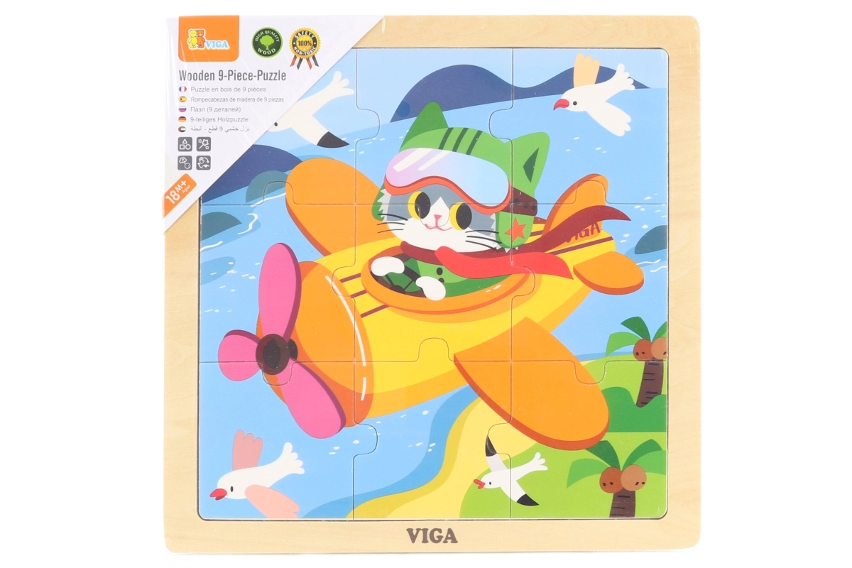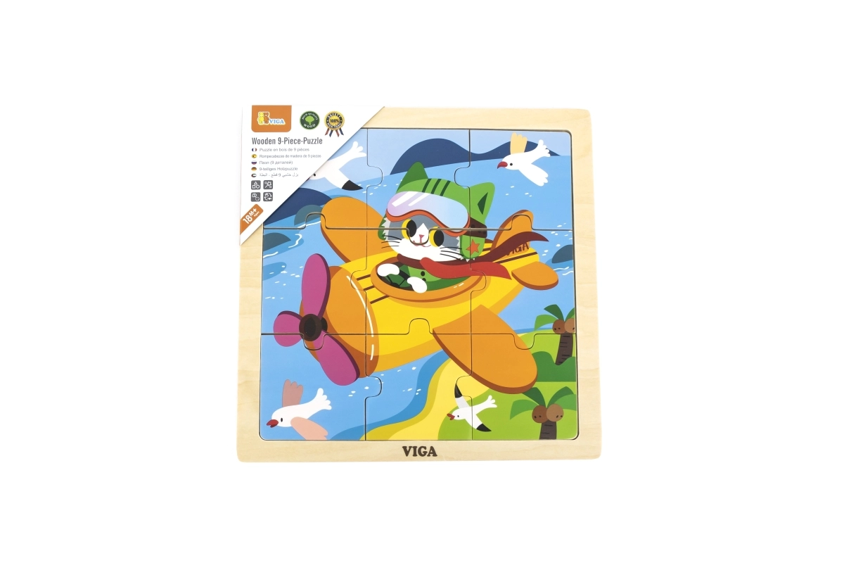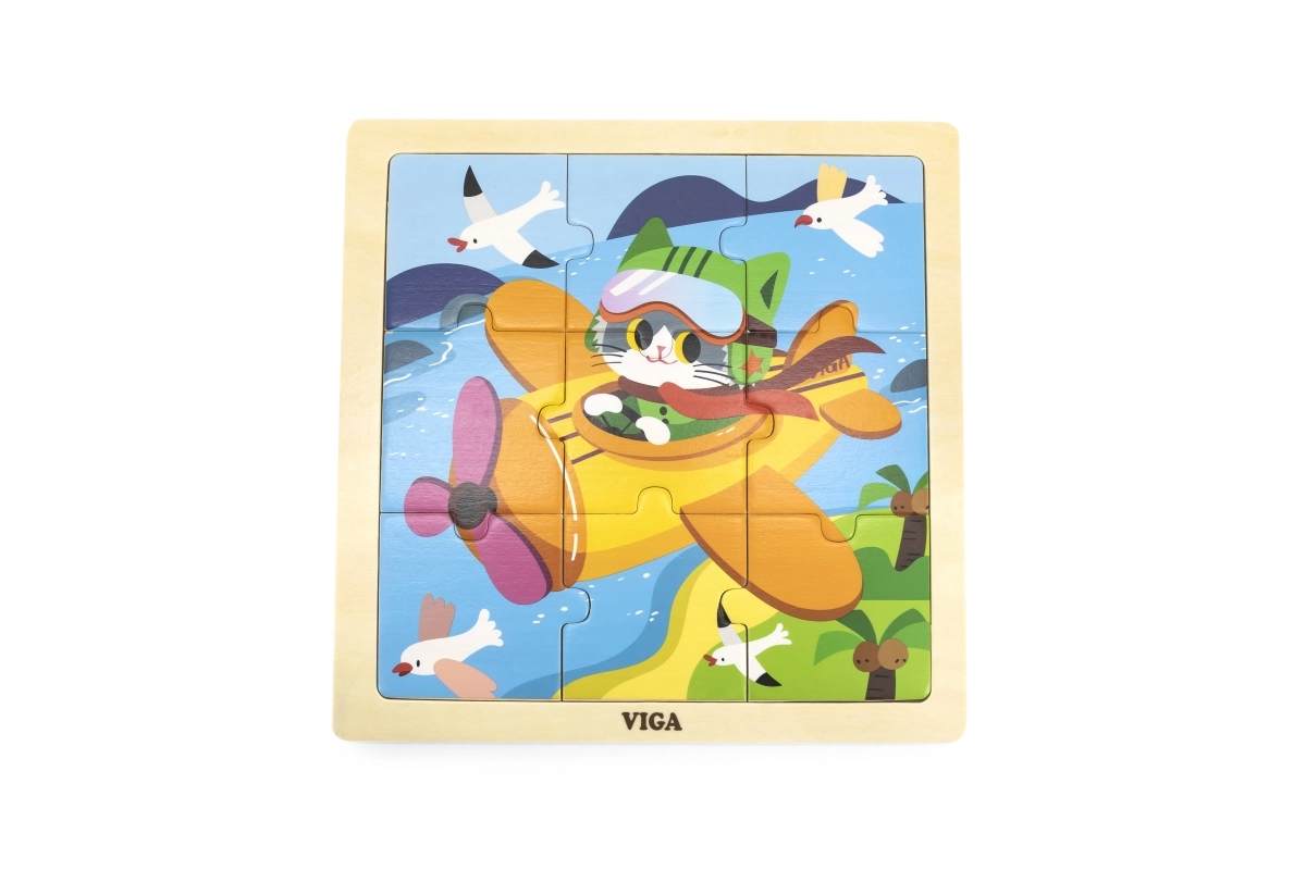 Подарете на децата забавно учене с дървения пъзел с мотив коте, което пилотира самолет. Деветте стабилни части и здравата дървена рамка помагат на децата да тренират прецизност, концентрация и радост от подреждането. Благодарение на ярките цветове и приятелския мотив пъзелът мотивира към многократна игра.