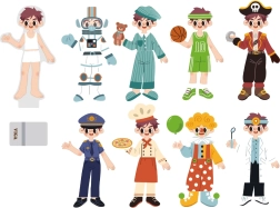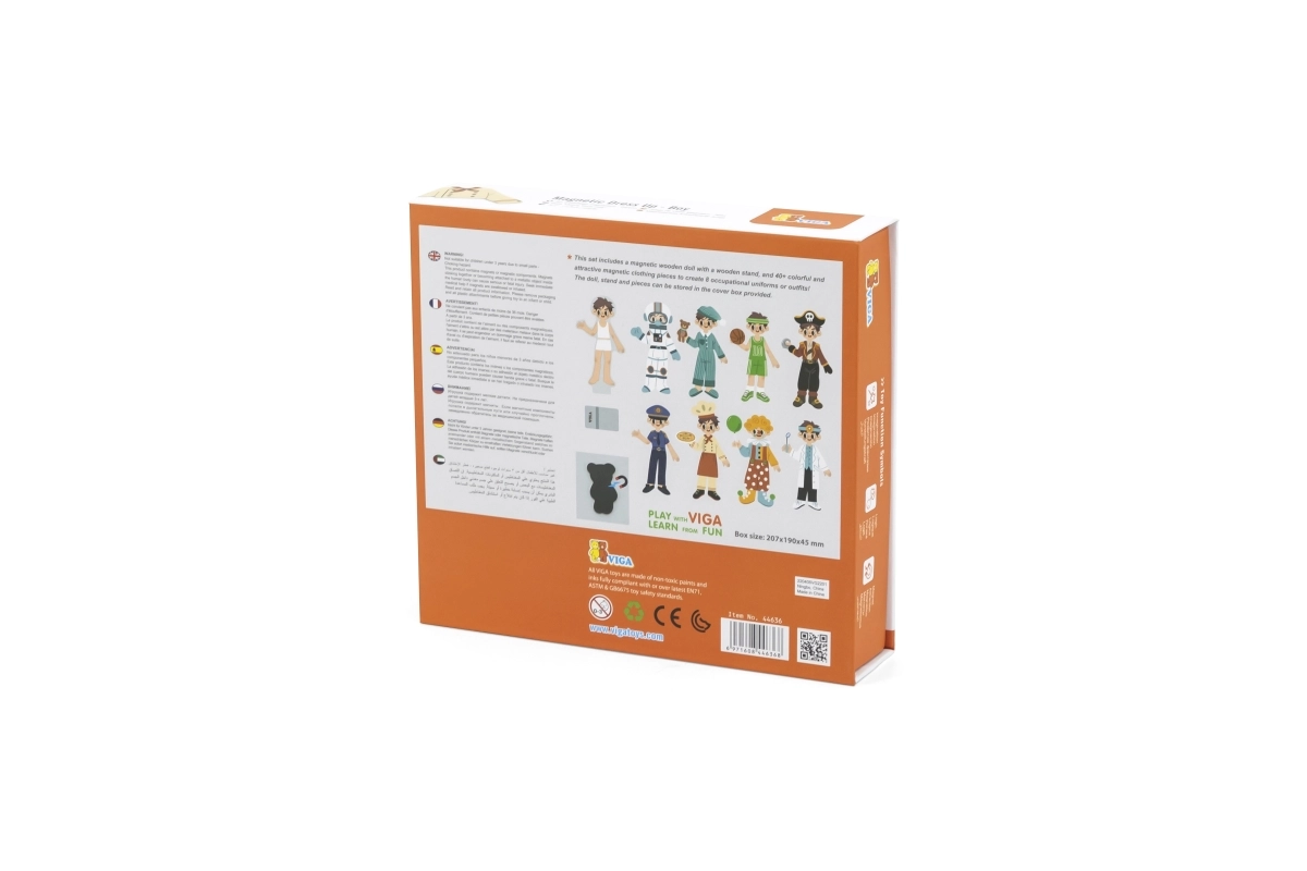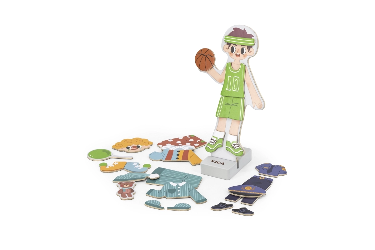 Тази висококачествена дървена играчка от марката VIGA предлага забавно преобличане на магнитна фигурка на момче. Благодарение на различните дрехи и аксесоари децата лесно създават оригинални тоалети, упражняват пръстчетата и се учат да комбинират цветове и стилове.