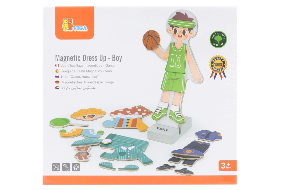 Открийте магнитния комплект за обличане VIGA за деца от 3 години, който носи креативна игра и развива фината моторика. Дървената фигурка на момче се облича лесно с помощта на магнитни елементи, така че децата могат да създават собствени комбинации от дрешки и да развиват фантазията и координацията око–ръка.