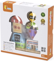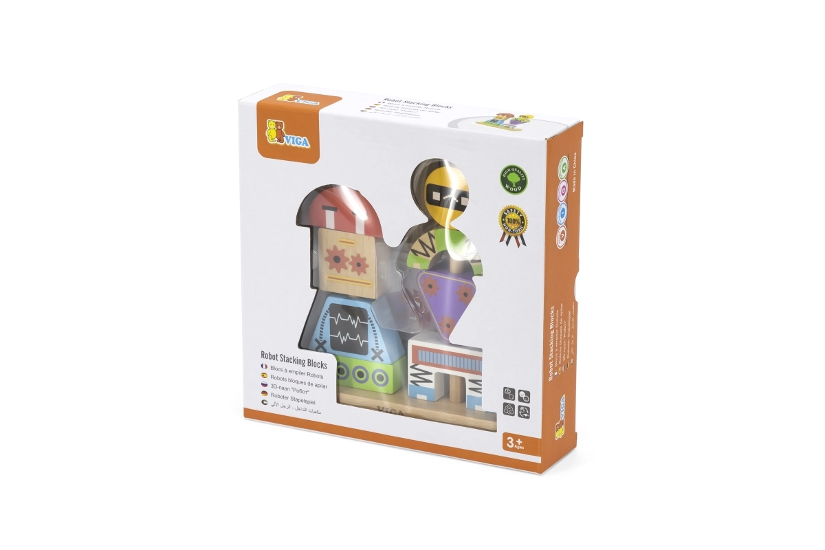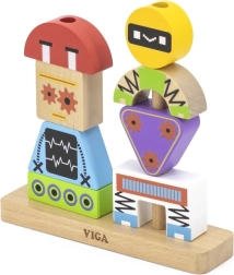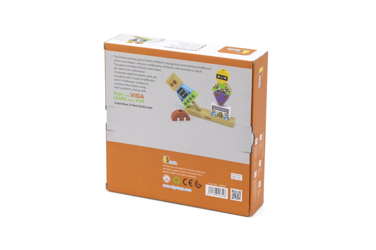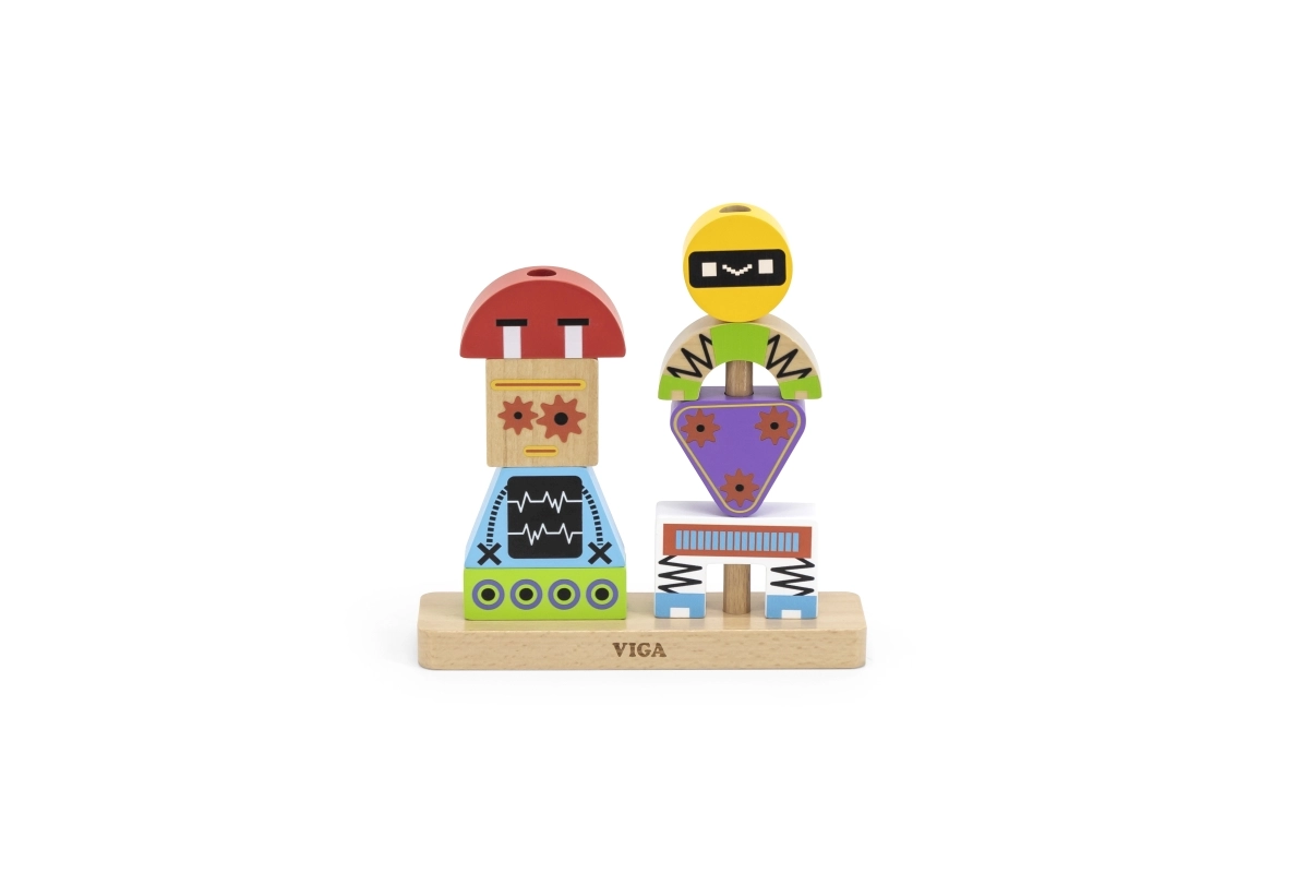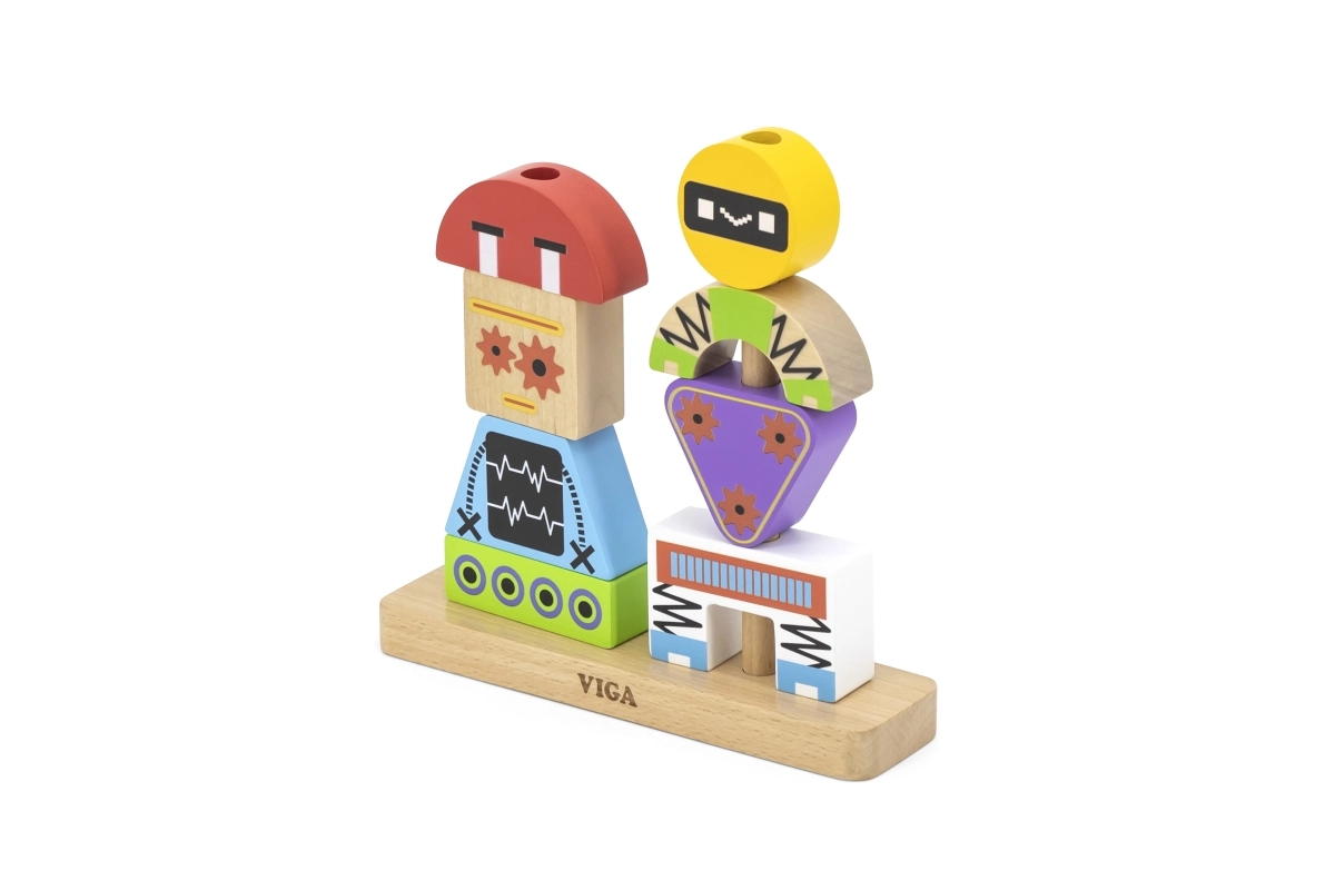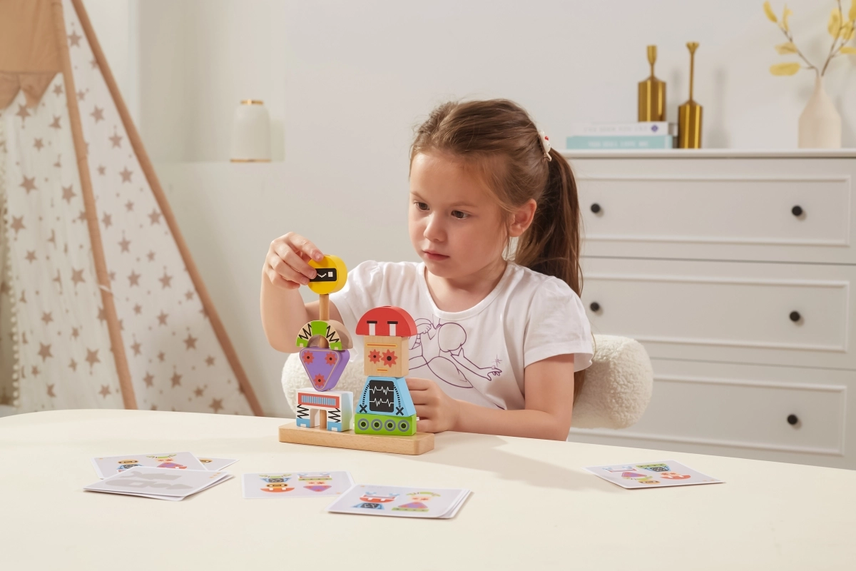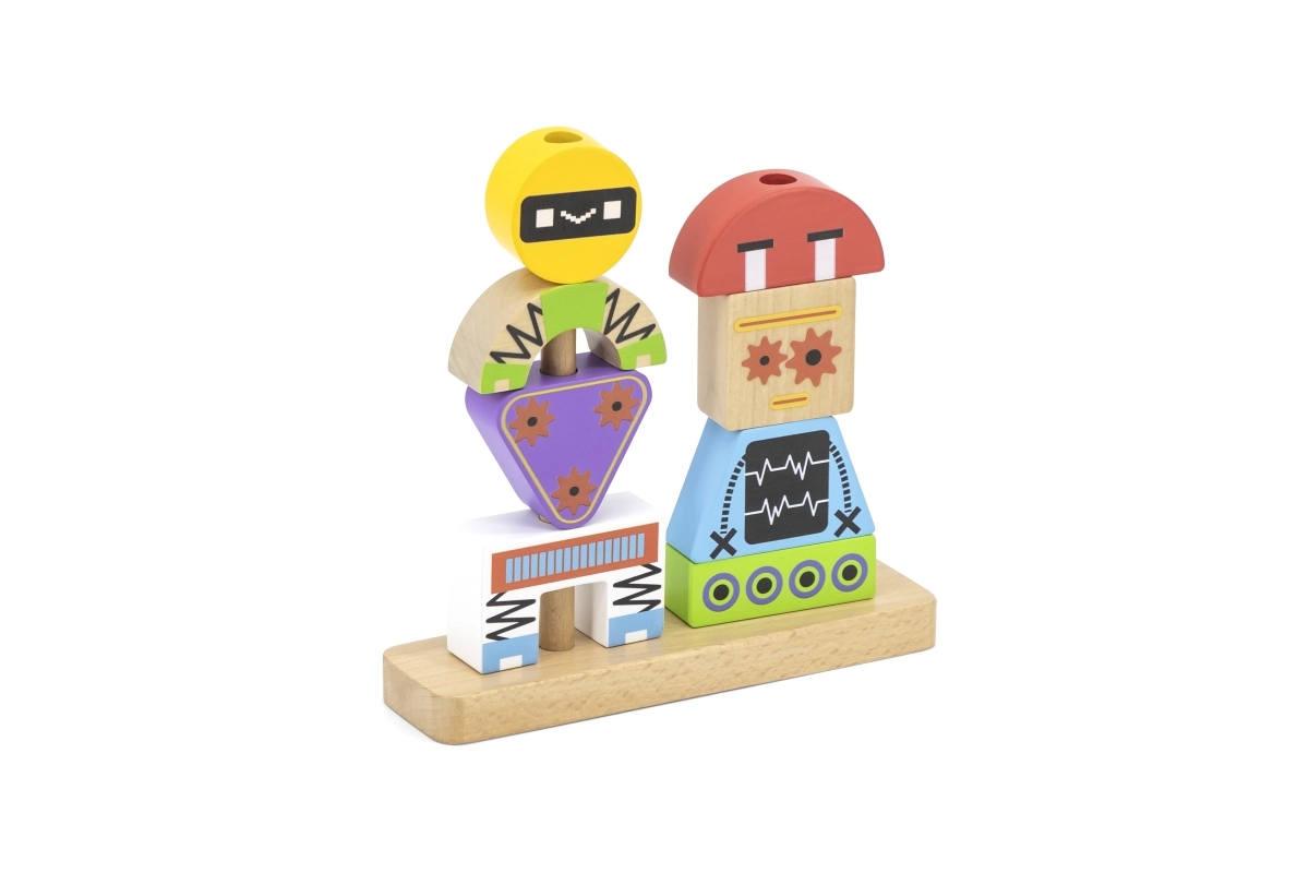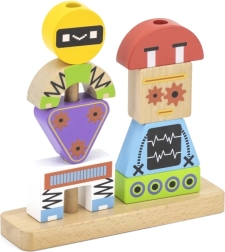 Открийте умна играчка, която расте заедно с децата. Дървените елементи в различни форми и цветове лесно се поставят върху колчетата на основата и позволяват да се сглобяват различни роботизирани фигури. Приложените карти с образци водят от по-прости към по-сложни комбинации и развиват концентрацията и търпението.