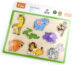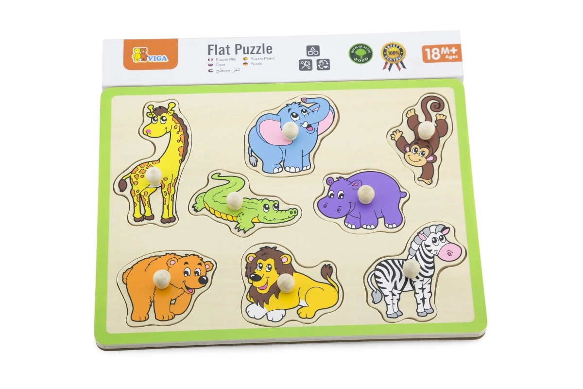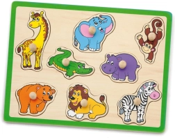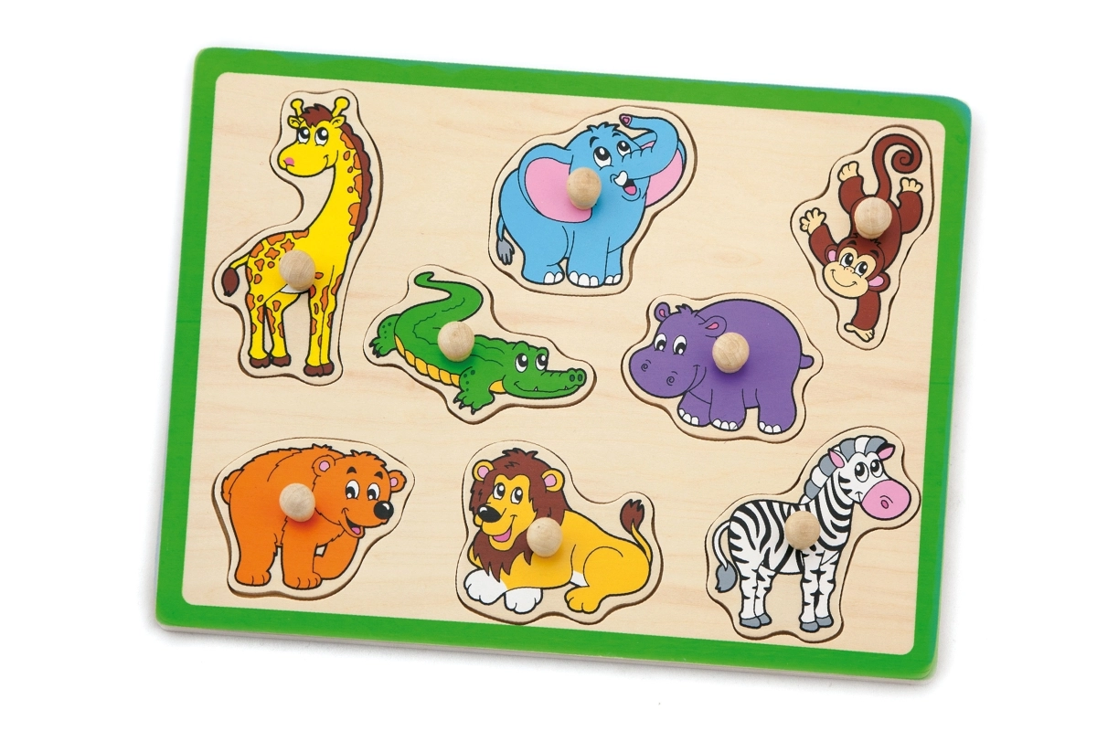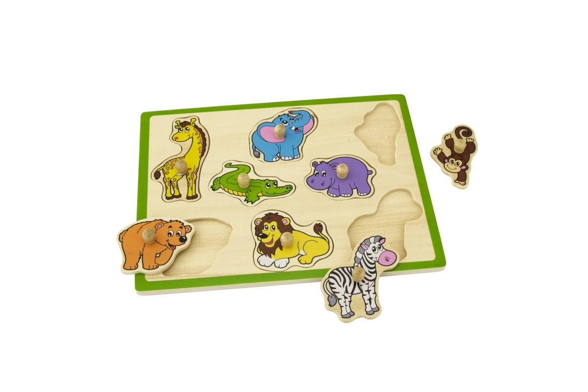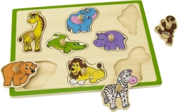 Забавна и образователна дървена влога с мотив на диви животни помага на деца от 18 месеца да развиват фината моторика, координацията око–ръка и разпознаването на форми и животни. Благодарение на дървените дръжки частите се хващат лесно и от малки ръчички. Здравата дъска с размер 30 × 22,5 cm и ярките цветове гарантират дълга и безопасна игра.