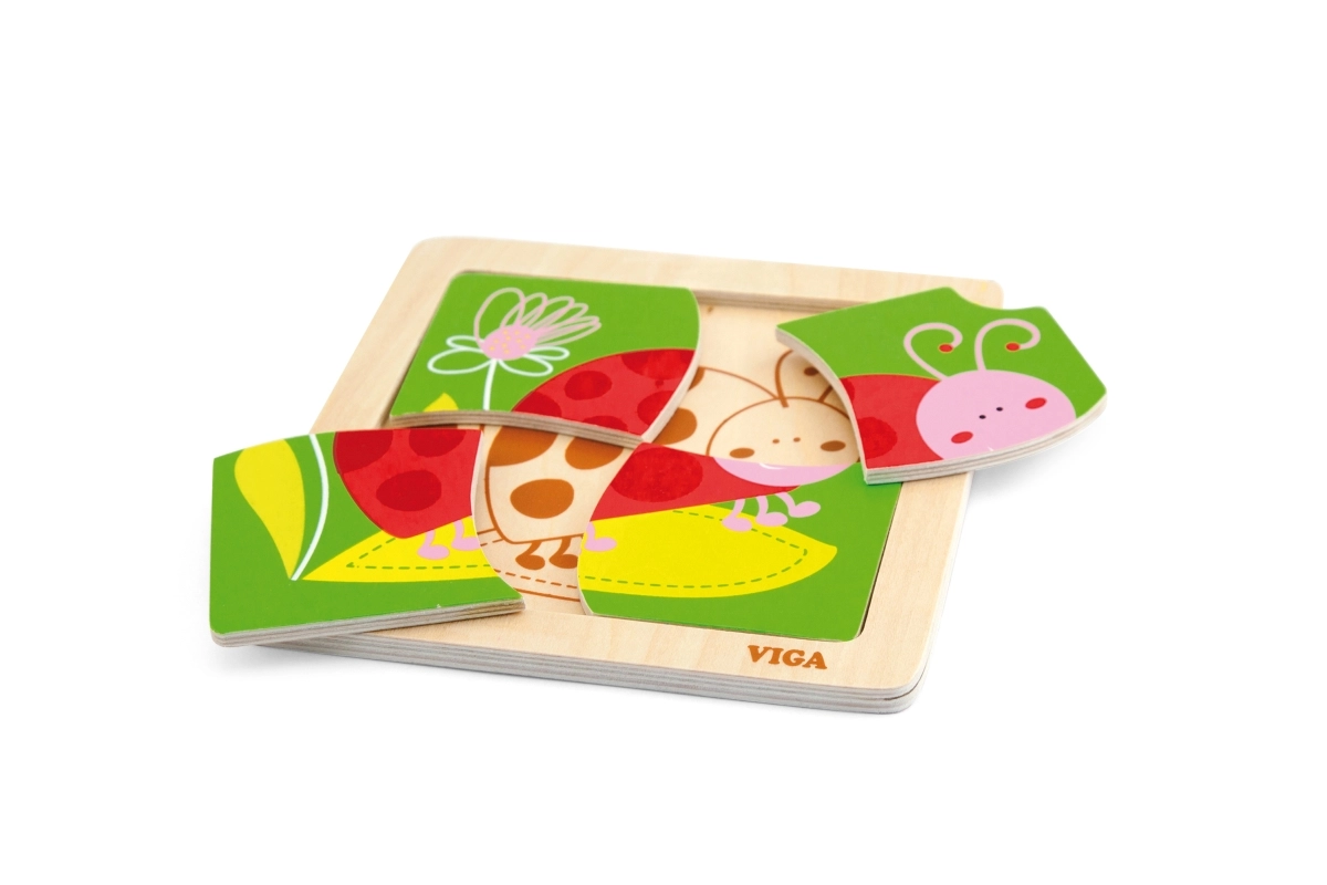 Този прост дървен пъзел с калинка е чудесен първи пъзел за малки деца. Благодарение на здравите, гладки части се държи добре в ръката и лесно се поставя в рамката. Мотивът в живи цветове мотивира към игра и подпомага концентрацията.