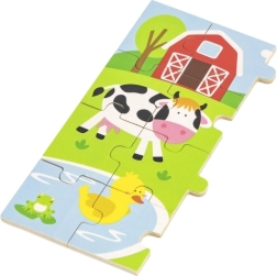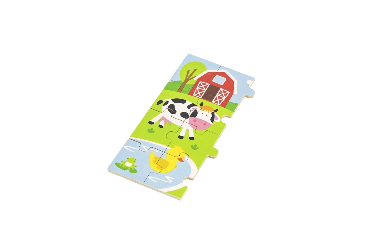Този дървен пъзел с фермерски мотив е идеален за деца, които тепърва се запознават със света на подреждането и главоблъсканиците. Илюстрацията на фермата е цветна и привлекателна, насърчаваща към игра и учене. Пъзелът може