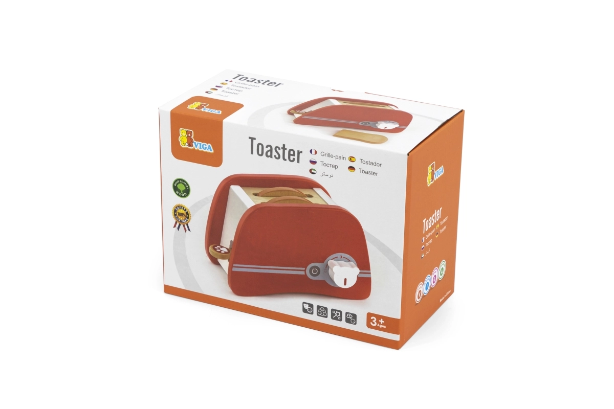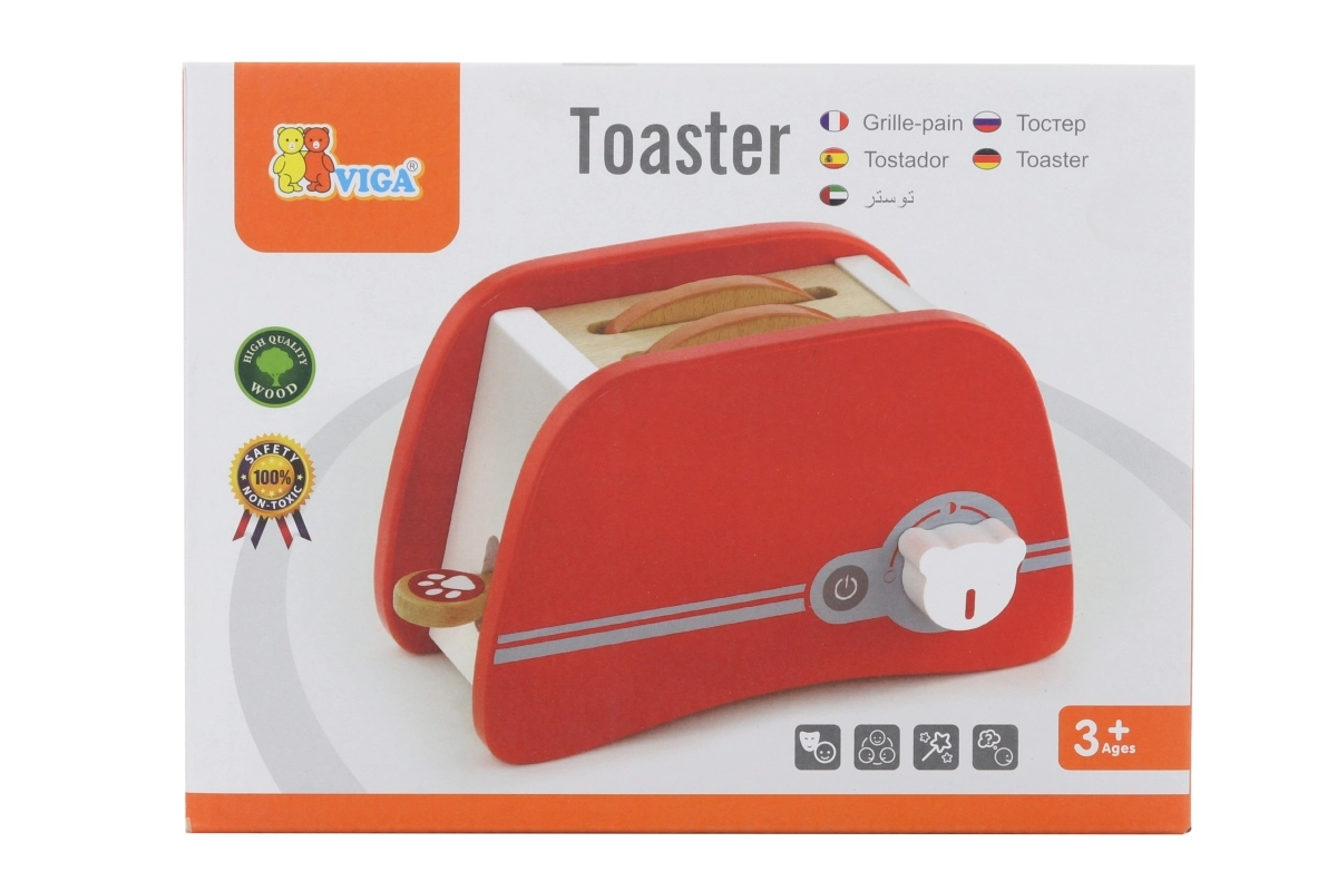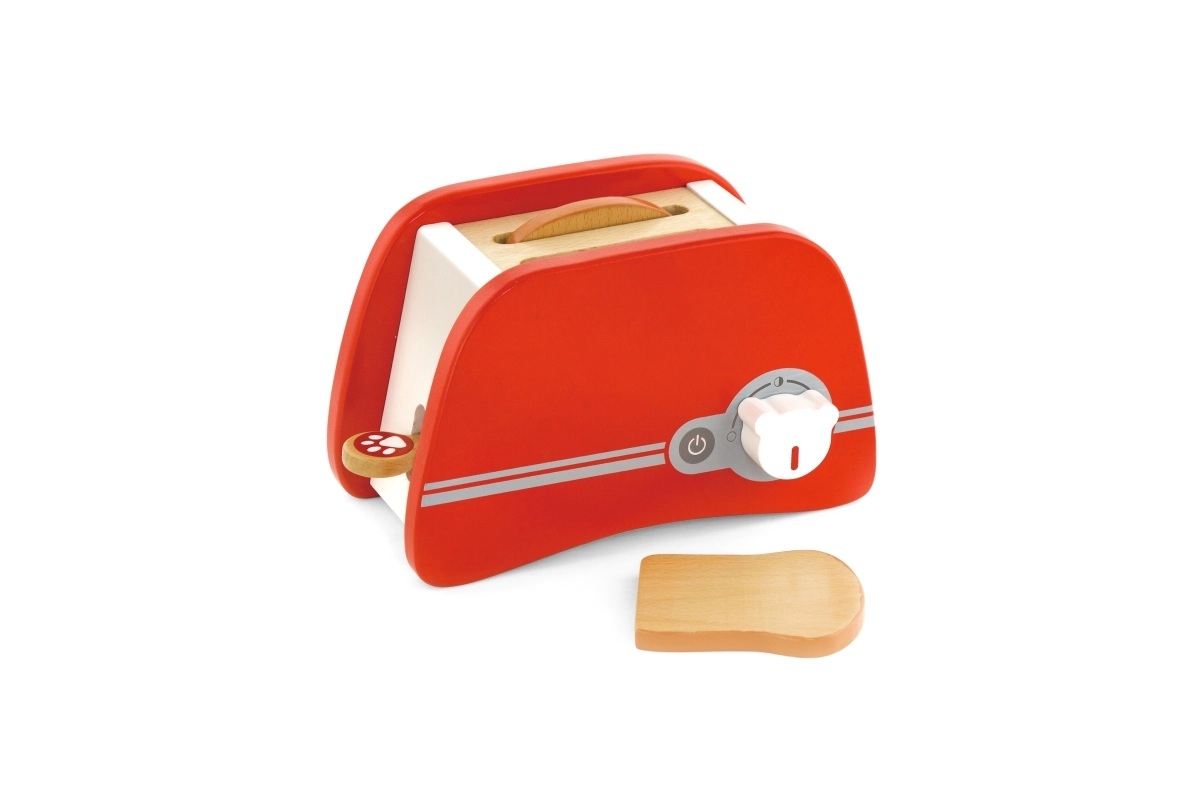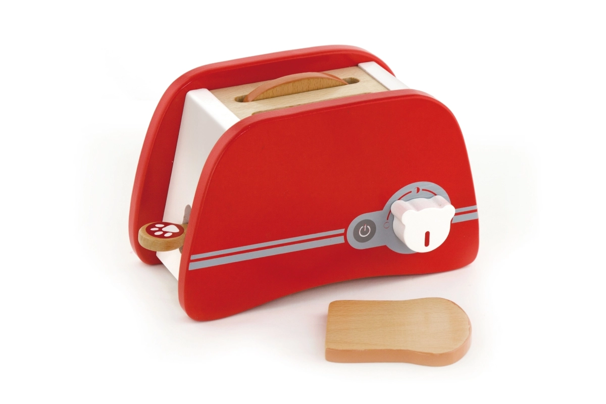 Дървеният тостер е перфектна играчка за деца от 3 години, които искат да имитират възрастните в кухнята. Този приятно цветен и издръжлив тостер позволява на децата да поставят дървени филийки и да настроят таймера, който осигурява филийката да „изскочи“ като при истински тостер. Размерите на тостера са съобразени с малките детски ръце, което го прави идеален инструмент за развитие на фината моторика и въображението.