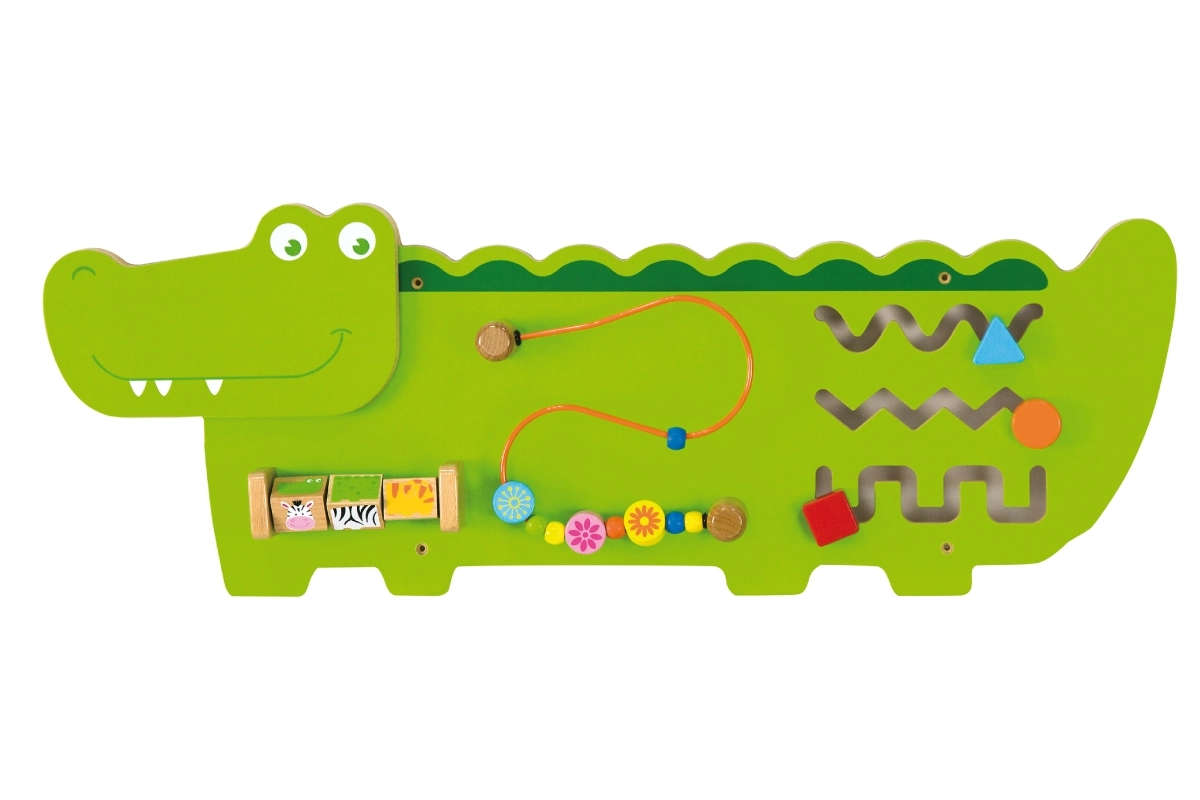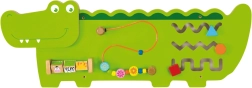 Дървената стенна сензорна дъска във форма на крокодил от Viga носи на децата часове умно забавление. Тя предлага лабиринти, плетена писта с дървени мъниста и въртящи се кубчета за развитие на фината моторика, координацията и логическото мислене. Изработена е от висококачествено дърво с FSC сертификат и е вдъхновена от принципите на Монтесори.