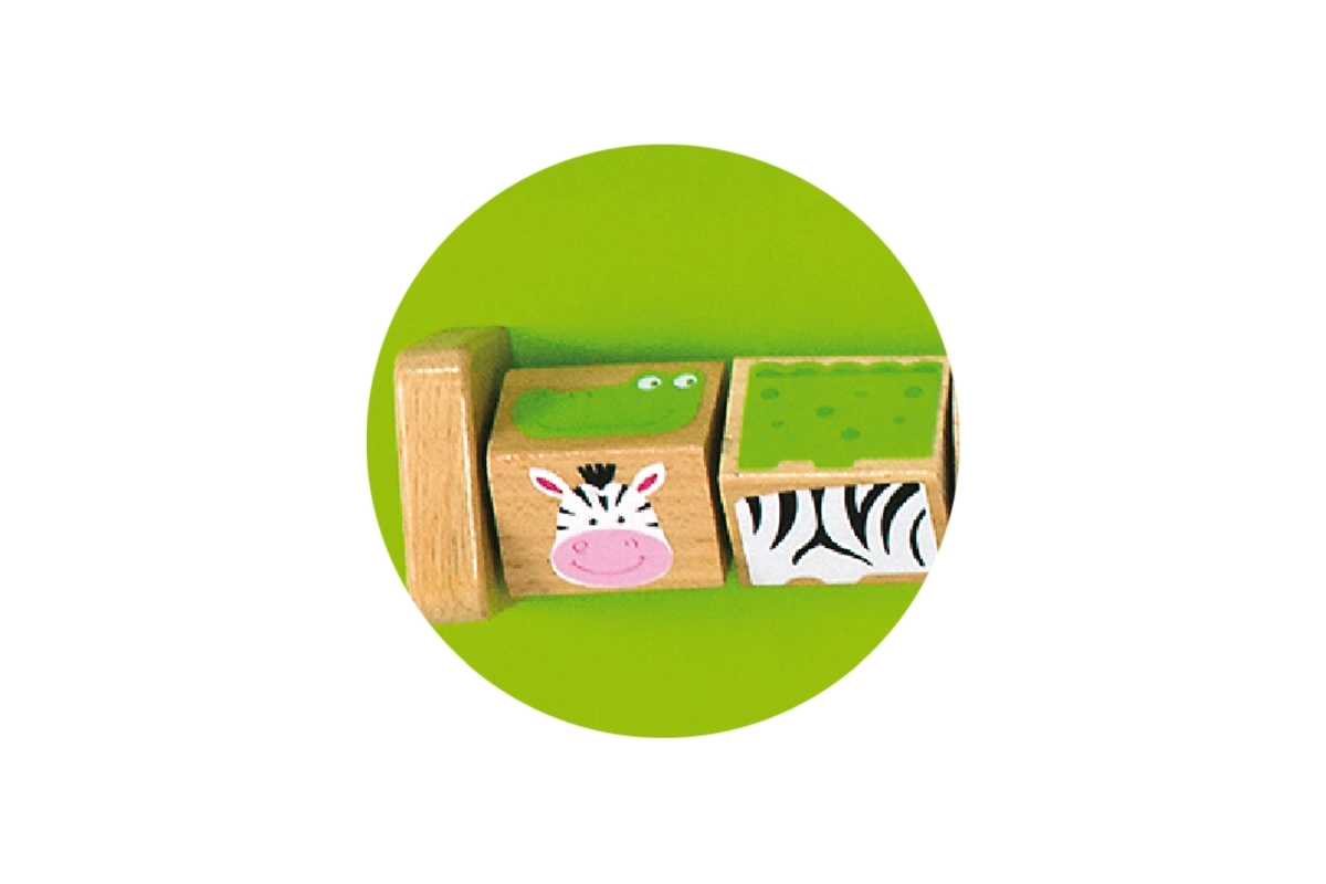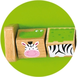 Три призми с илюстрации на животни, които децата завъртат и подреждат до правилната картина – тренират логика, търпение и визуално възприятие.