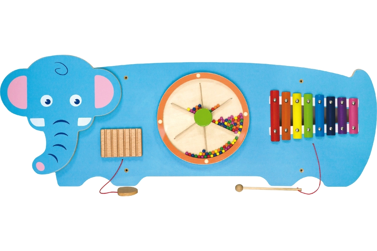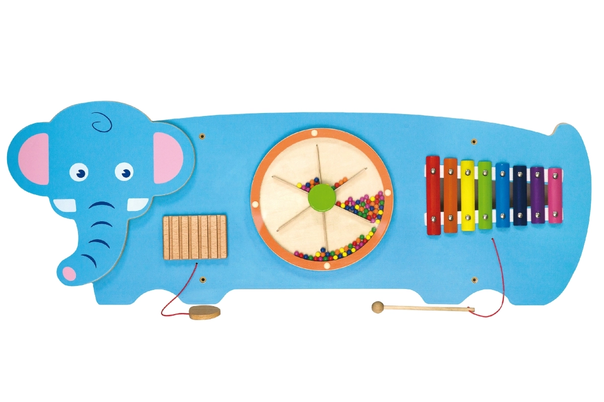 Открийте забавния стенен панел във форма на слон от марката VIGA, който развива фината моторика, сетивното възприятие и музикалния усет. Благодарение на елементи като ксилофон, воденично колело с топчета и звукова (набраздена) летва децата тренират координация, цветовете и ритъма – идеално за детска стая, детска градина или игрова зала.