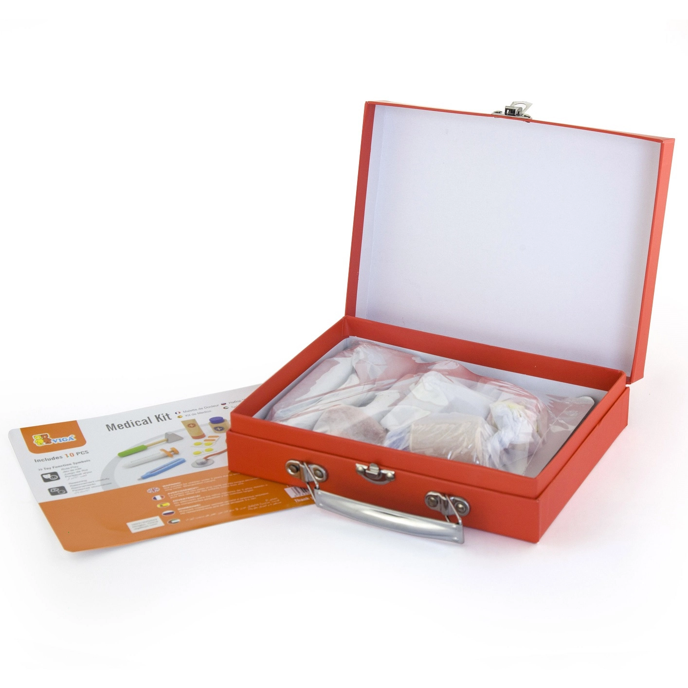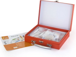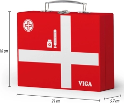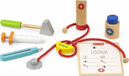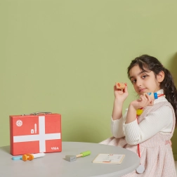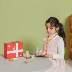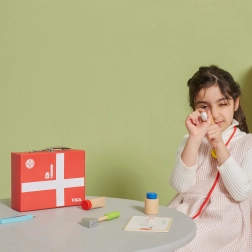 Този красив лекарски комплект в здраво дървено куфарче ще зарадва всички малки лекари и лекарки. Децата могат да слушат сърчицето със стетоскоп, да „мерят“ температура с термометър, да поставят инжекция или да попълнят пациентска карта за плюшени играчки и кукли. Играта на доктор е забавна ролева активност, която развива социални умения, чувствителност и емпатия.