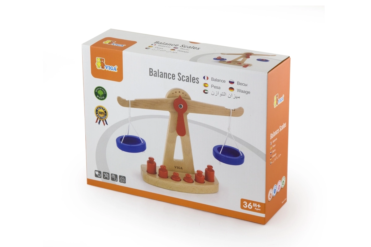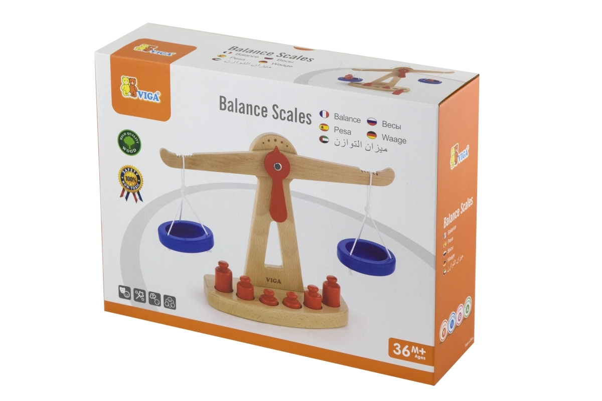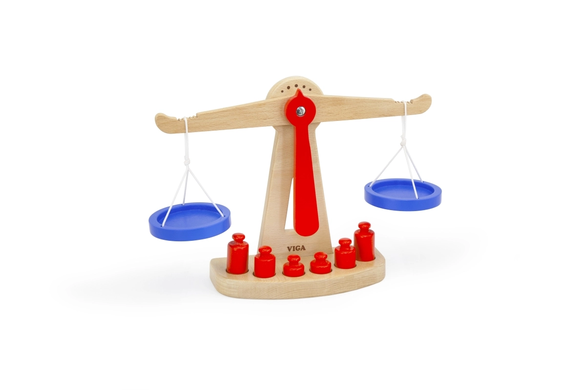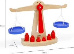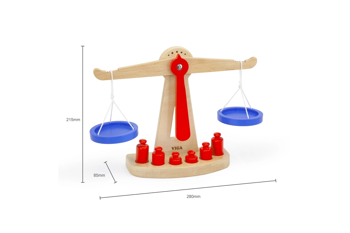 Дървената балансираща везна на марката Viga е оборудвана с две сини купички, окачени на връвчици, и съдържа шест червени тежести с различни размери. Благодарение на своя цветен дизайн и безопасно покритие тази везна носи на децата много забавление. Везната е проектирана да мотивира децата да използват своето въображение и фантазия в игра на магазин, което им помага да разберат основни математически концепции и стойността на баланса.