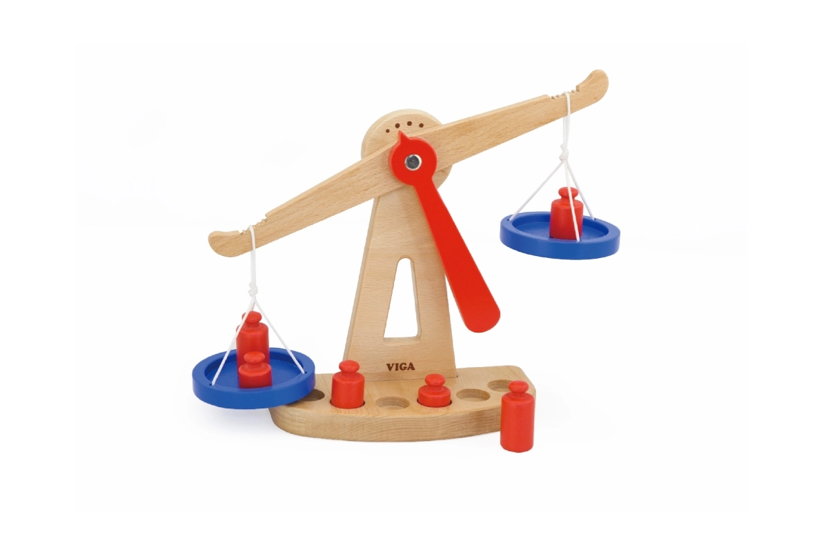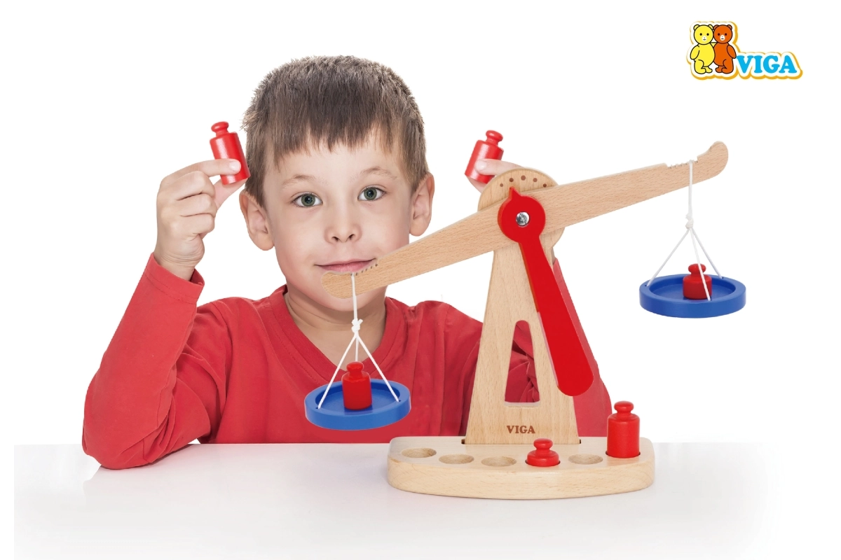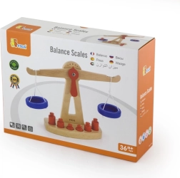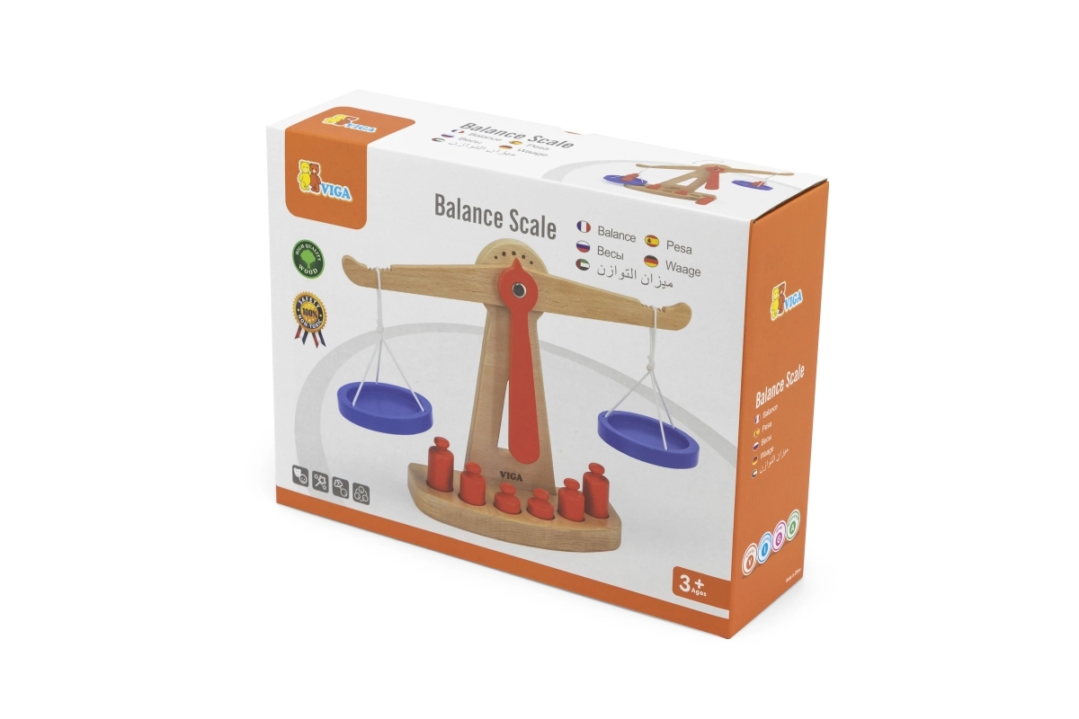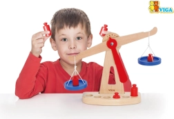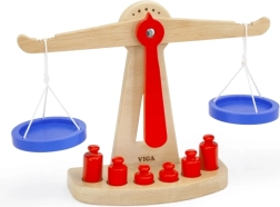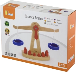 Дървената балансираща везна на марката Viga е оборудвана с две сини купички, окачени на връвчици, и съдържа шест червени тежести с различни размери. Благодарение на своя цветен дизайн и безопасно покритие тази везна носи на децата много забавление. Везната е проектирана да мотивира децата да използват своето въображение и фантазия в игра на магазин, което им помага да разберат основни математически концепции и стойността на баланса.