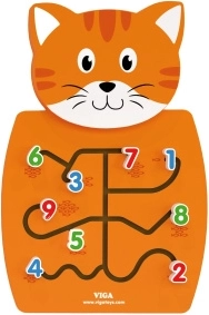 Дървена котка с лабиринти за преместване на числа и развитие на фината моторика.