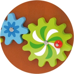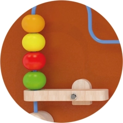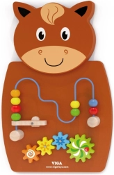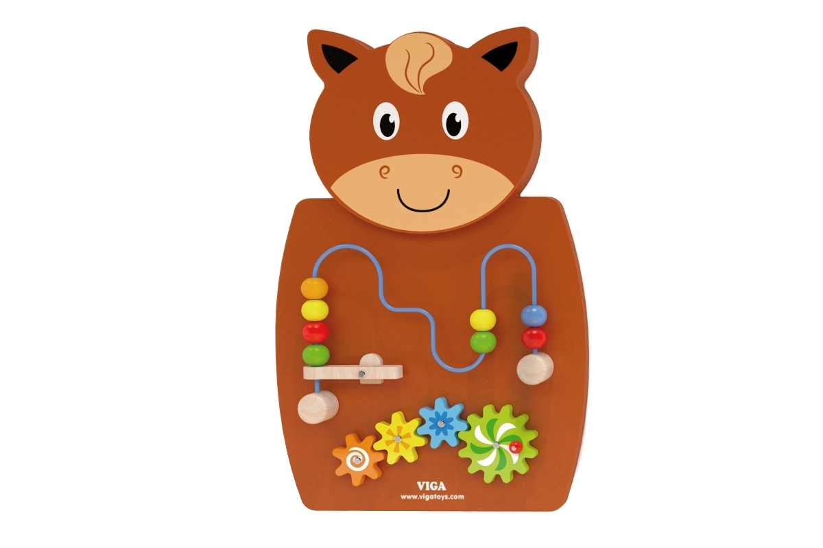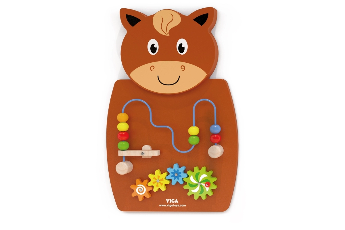 Дървената активна дъска във формата на кон е една от водещите играчки за развитие на креативността и ученето при децата. Оборудвана е с дървени зъбни колела и пътечка за мъниста по тел, които децата могат да придвижват с помощта на лостов механизъм. Тази играчка привлича с разнообразието от цветове и форми, като подпомага развитието на уменията за разпознаване на цветове и форми.