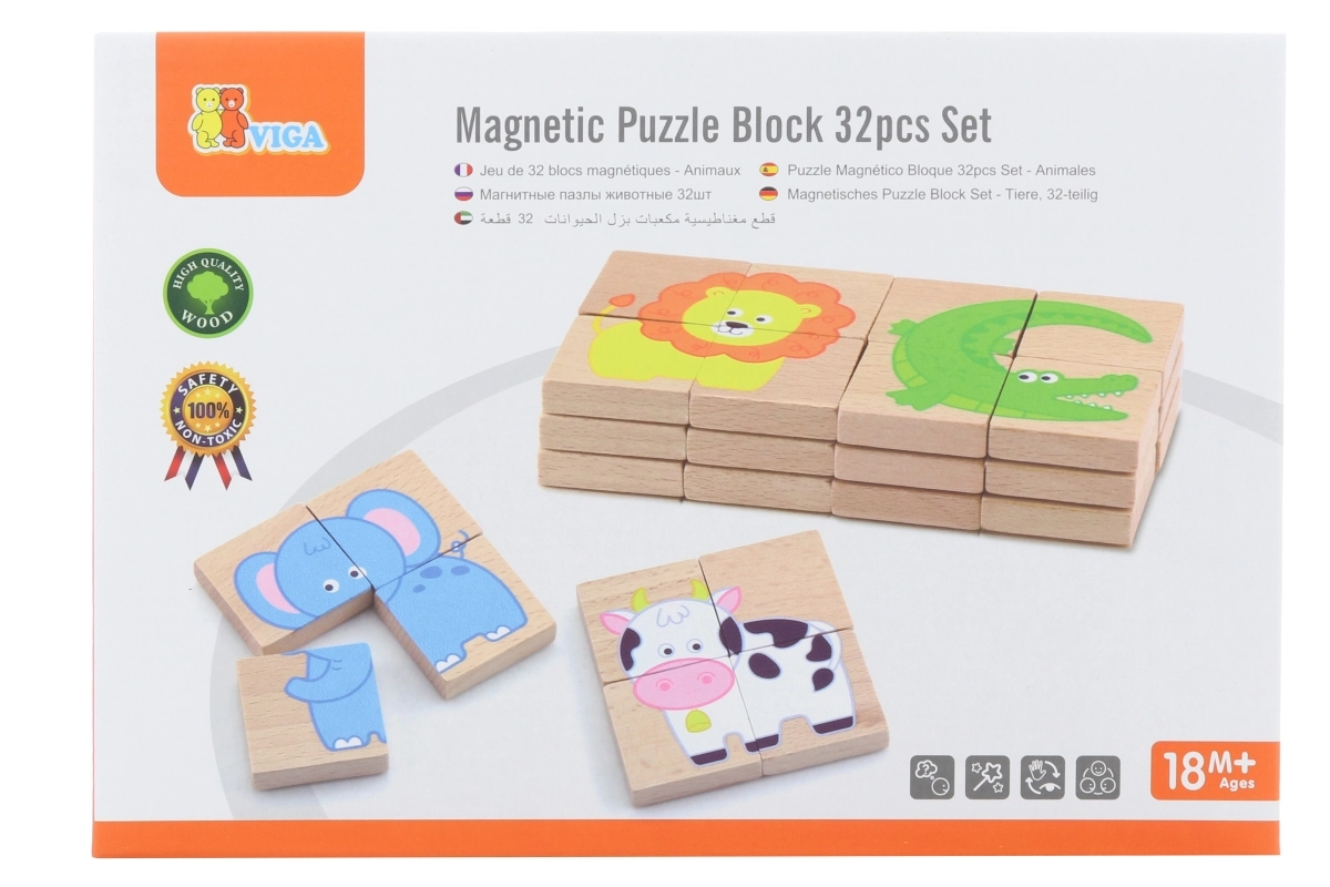 Viga Магнитни пъзели Животни предоставят на децата възможност за креативна игра и учене. Този забавен комплект включва 32 цветни магнитни пъзела с животински мотиви, които насърчават въображението и моторните умения.