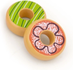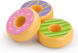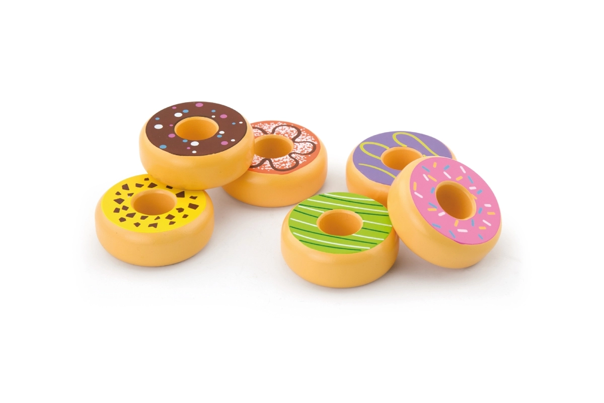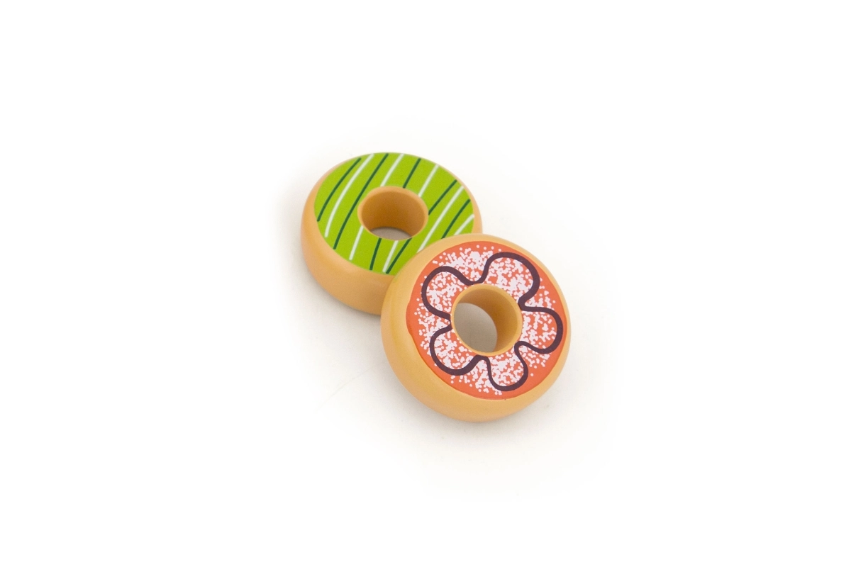 Игрив комплект от шест дървени понички за деца от 18 месеца, който подпомага фината моторика, фантазията и ролева игра на магазин или кафе. Всяка поничка има различна цветна украса и приятно гладка повърхност за безопасно боравене.