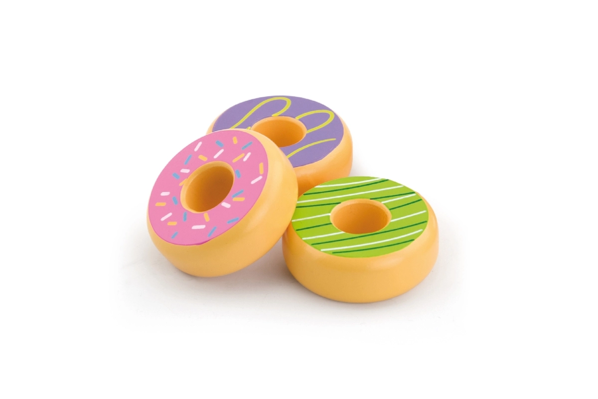 С този цветен комплект понички децата развиват сетивното възприятие, координацията око–ръка и творческата игра. Здравата дървена изработка с гладки ръбове е идеална за малки ръчички и издържа на всекидневна игра.