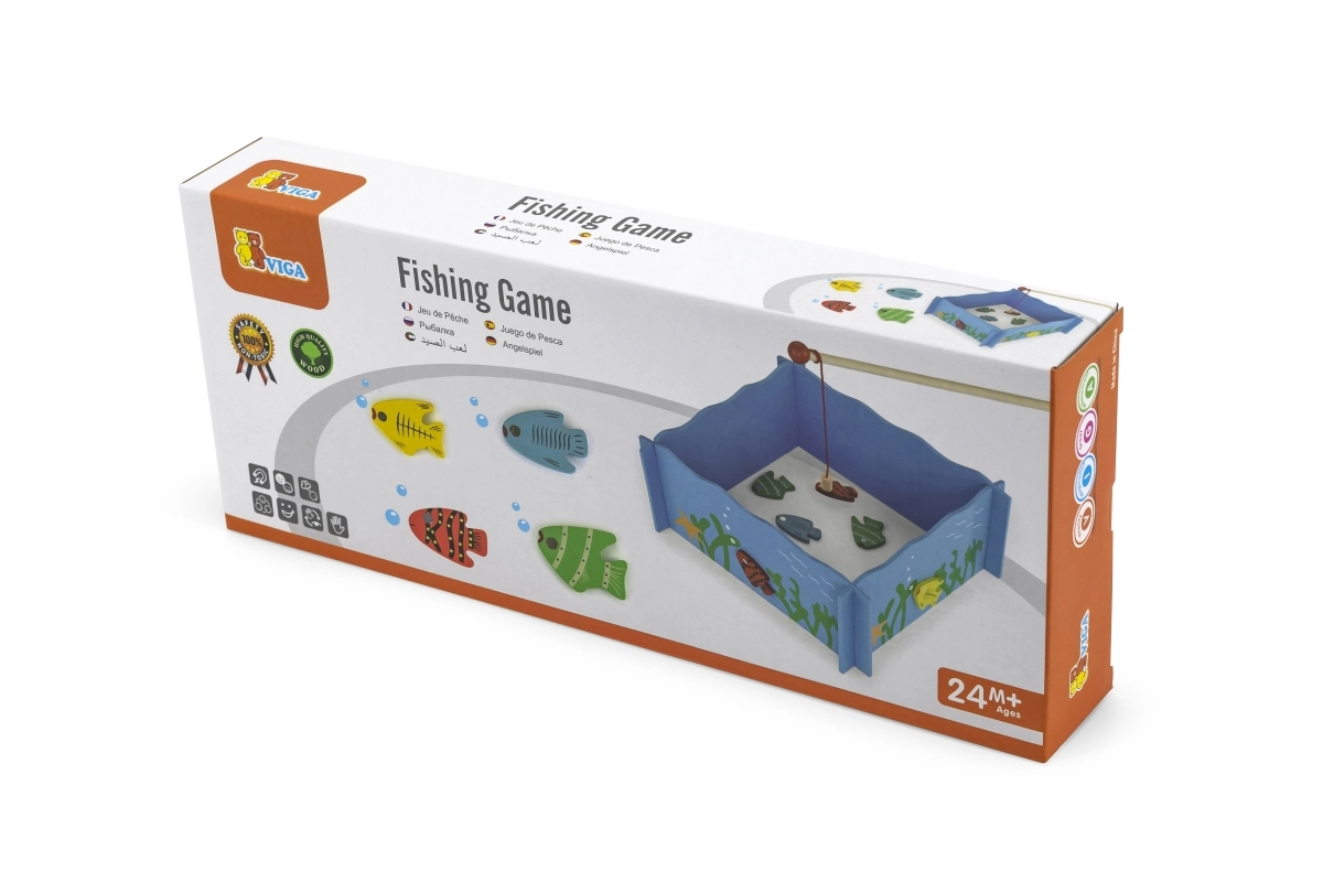 Забавната и качествена дървена магнитна игра Риболов развива фината моторика, координацията око–ръка и търпението на деца от 24 месеца. Съдържа рибарски басейн, 4 магнитни въдици и 20 цветни рибки с числа за учене и игра.