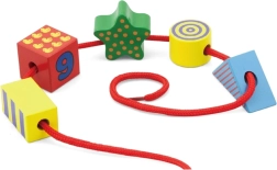 Този дървен нанизващ комплект предлага на децата безкрайни възможности за творчество: нанизване като мъниста, строене на комини и къщички или сортиране по цветове и форми. Големите елементи (около 4 см) се държат лесно и са идеални за първи моторни упражнения.