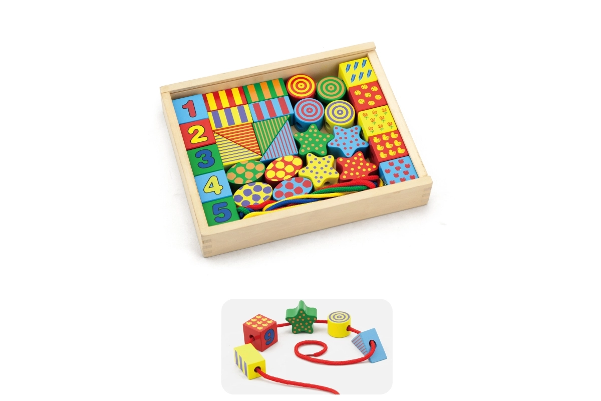 Открийте креативната игра с дървения нанизващ комплект VIGA – кутийка, пълна с цветни форми за нанизване на връвчици като мъниста. Подпомага фината моторика, координацията око–ръка и ученето на цветове и форми. Части от качествено дърво с нетоксични бои и голям размер за безопасно захващане.