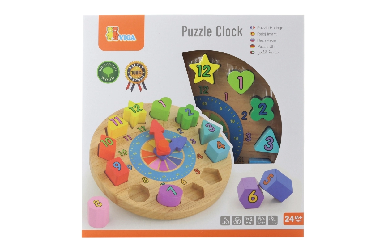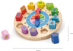 Открийте качествен дървен пъзел-часовник, който съчетава игра и учене. Децата по забавен начин ще се научат да разпознават числа, цветове и форми, докато поставят отделните елементи на правилните места. Здравата дървена изработка осигурява дълъг живот и безопасна игра.