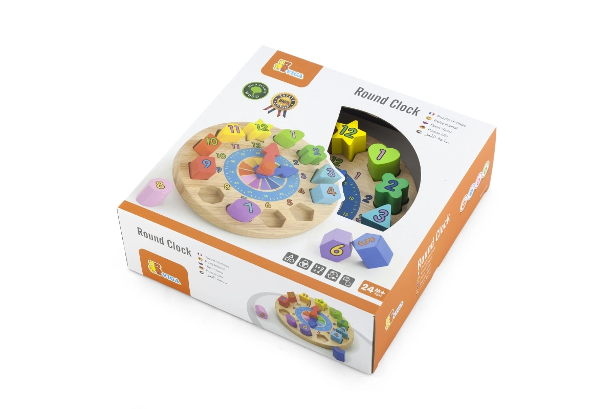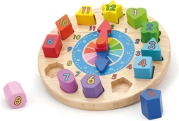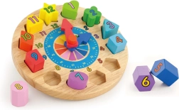 Забавен и образователен дървен часовник за най-малките, който помага да се научат да разпознават времето, цветовете и формите. Съдържа 12 цветни вложки с числа, които развиват фината моторика, логиката и координацията око–ръка. Идеална играчка за деца от 24 месеца.