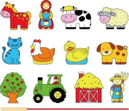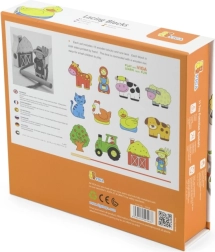 Блокчетата представят различни фермерски форми като животни, трактор, плевня и други, стимулирайки креативната игра и разказването на истории.