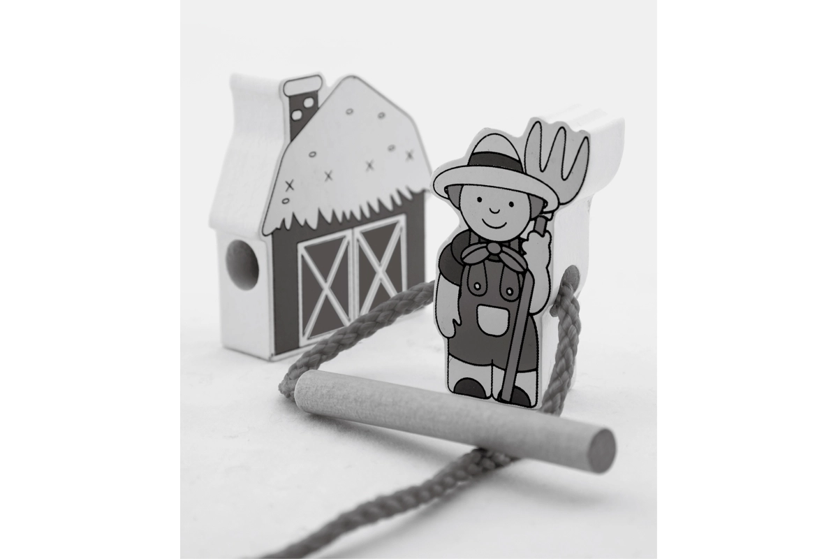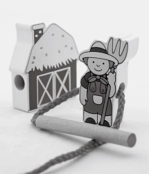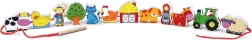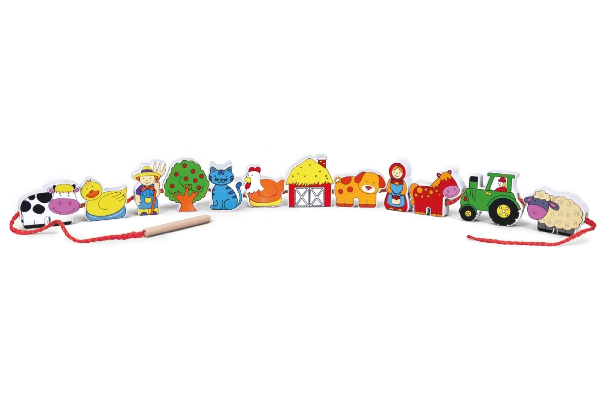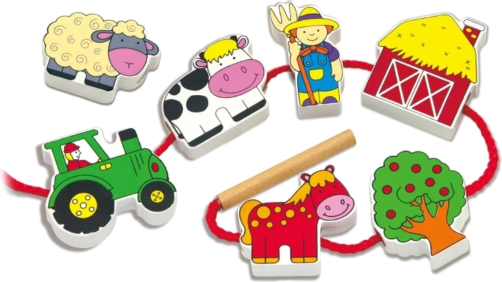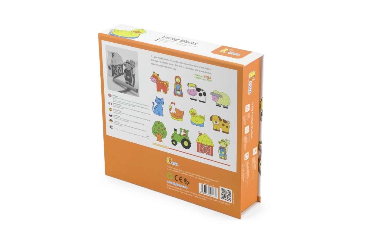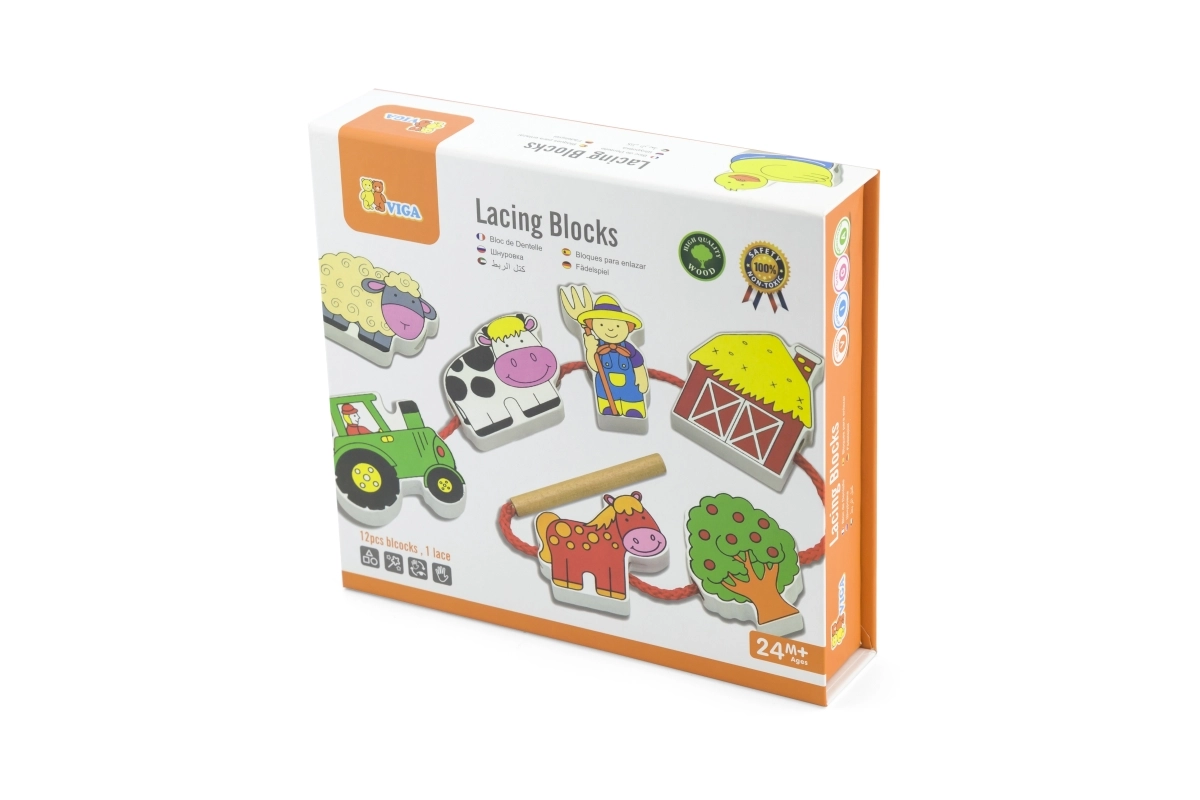 VIGA Дървени Нанизващи Фермерски Блокчета са проектирани да привличат вниманието на всяко дете. Този комплект съдържа 12 цветни блокчета с фермерски мотиви, които вашето дете може да нанизва заедно с включената връв. Налични са различни форми като крава, патица, котарак, кокошка, куче, кон, овца, фермер и неговата съпруга, трактор, плевня и ябълка/ябълково дърво.