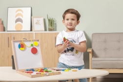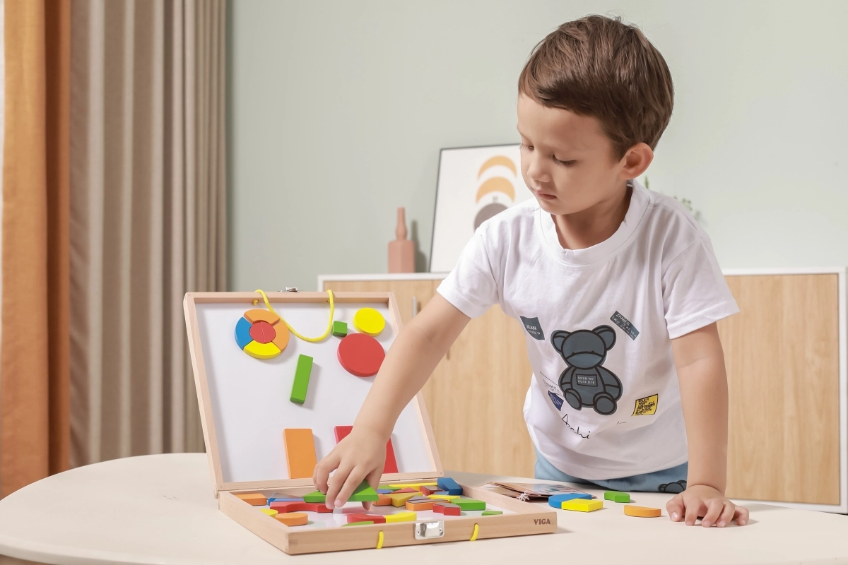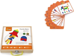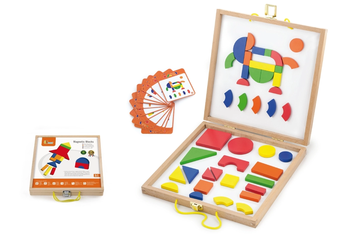 Комплектът включва 42 дървени магнитни части в различни форми и цветове, както и 12 двустранни карти с общо 24 оригинални шаблона за лесен старт. Докато играят, децата упражняват фината моторика, координацията око–ръка, възприемането на цветове и форми и пространственото мислене.