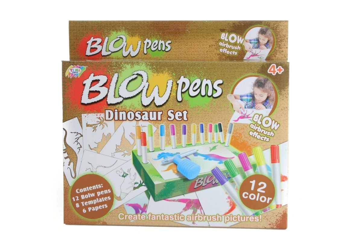 - 12 въздушни флумастера, 8 шаблона, 6 листа, накрайник за издухване с помпичка, картонена подложка и стойка за флумастери
