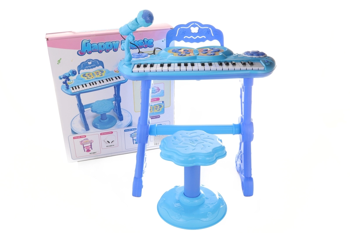 Синьо детско пиано предлага не само класически тонове, но и различни фонови мелодии и възможност за промяна на музикалните инструменти. В комплекта са включени микрофон и конектор за MP3 плейър.