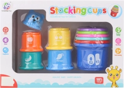 Комплектът пластмасови сгъваеми чашки е идеална играчка за развитие на уменията на деца от 6 месеца. Благодарение на различните цветове и размери децата откриват принципите на сортиране, сравняване и строене. Чашките са леки, издръжливи и лесни за поддръжка.