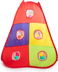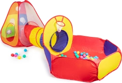 Забавен игрови комплект за деца с цветна палатка, тунел и сух басейн за топчета за игра у дома и в двора. Включени са 100 цветни топчета, кош за хвърляне и мишени с 3 велкро топчета. Саморазгъваща се конструкция, бърз монтаж и лек полиестерен калъф гарантират лесна употреба и дълги часове активна забава.