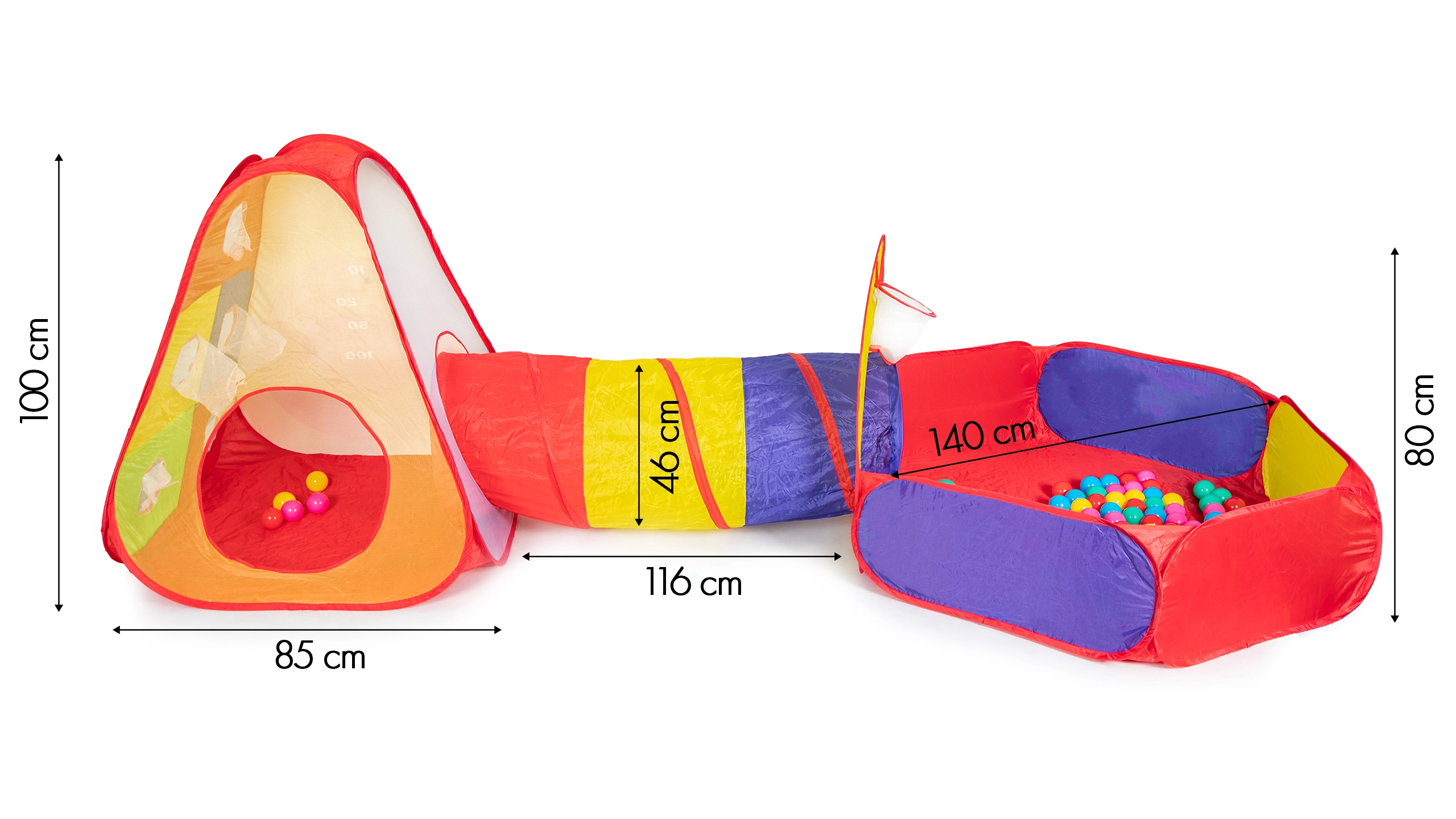 - Пълен сет: палатка + тунел + сух басейн + 100 топчета + 3 велкро топчета