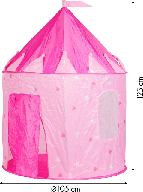 Всяко дете заслужава свой собствен кът за игра. Тази игрова палатка във форма на принцески замък предлага уютно и безопасно място за фантазии, криеница и четене. Благодарение на атрактивния дизайн със сърчица и звездички чудесно се вписва в детската стая, на терасата или в градината.
