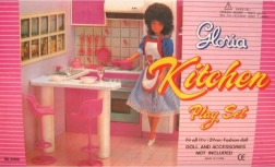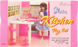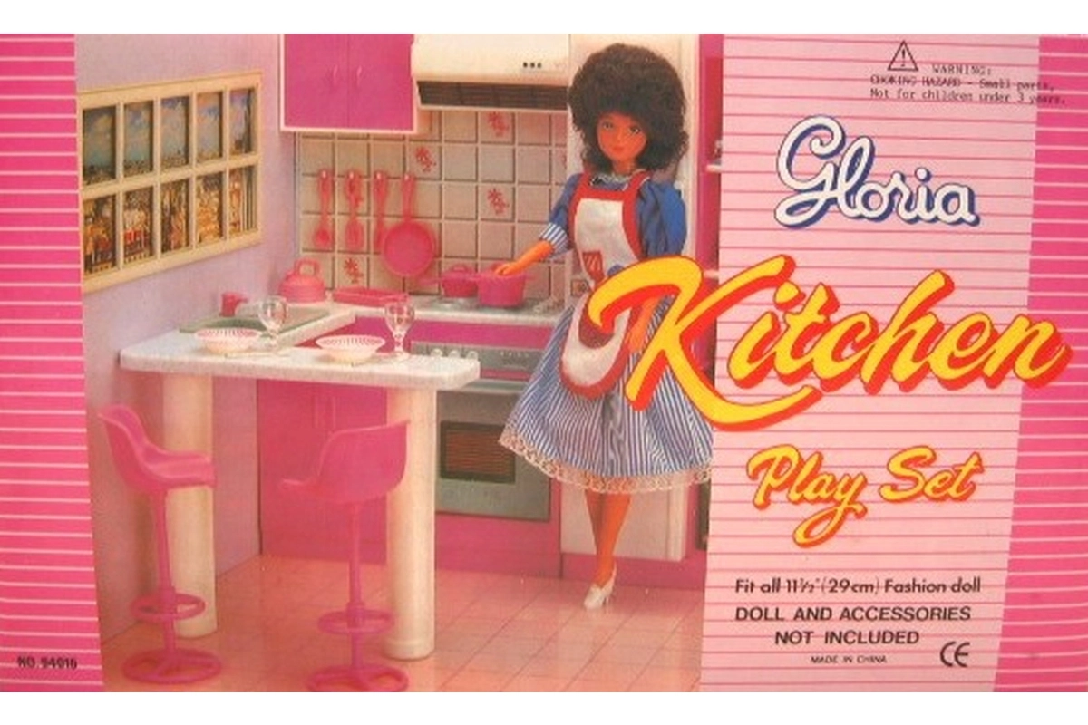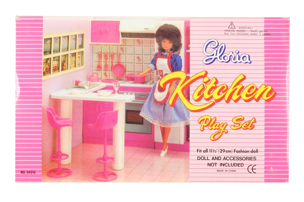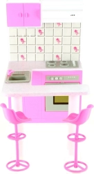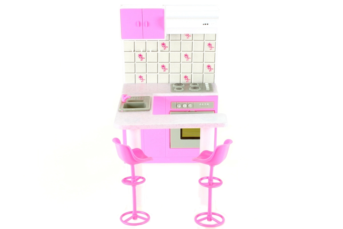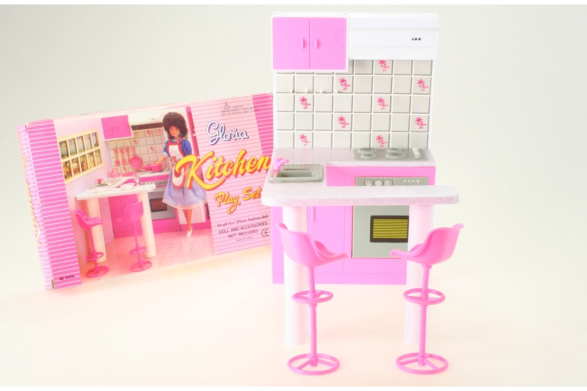 Стилен кухненски комплект за кукли марка Glorie превръща всяка детска стая в малко кулинарно кралство. Предлага кухненски кът с отваряема фурна (декоративна), мивка и котлони/печка (нефункционални), както и трапезна маса с две бар столчета. Идеален за креативна игра на деца от 3 години.