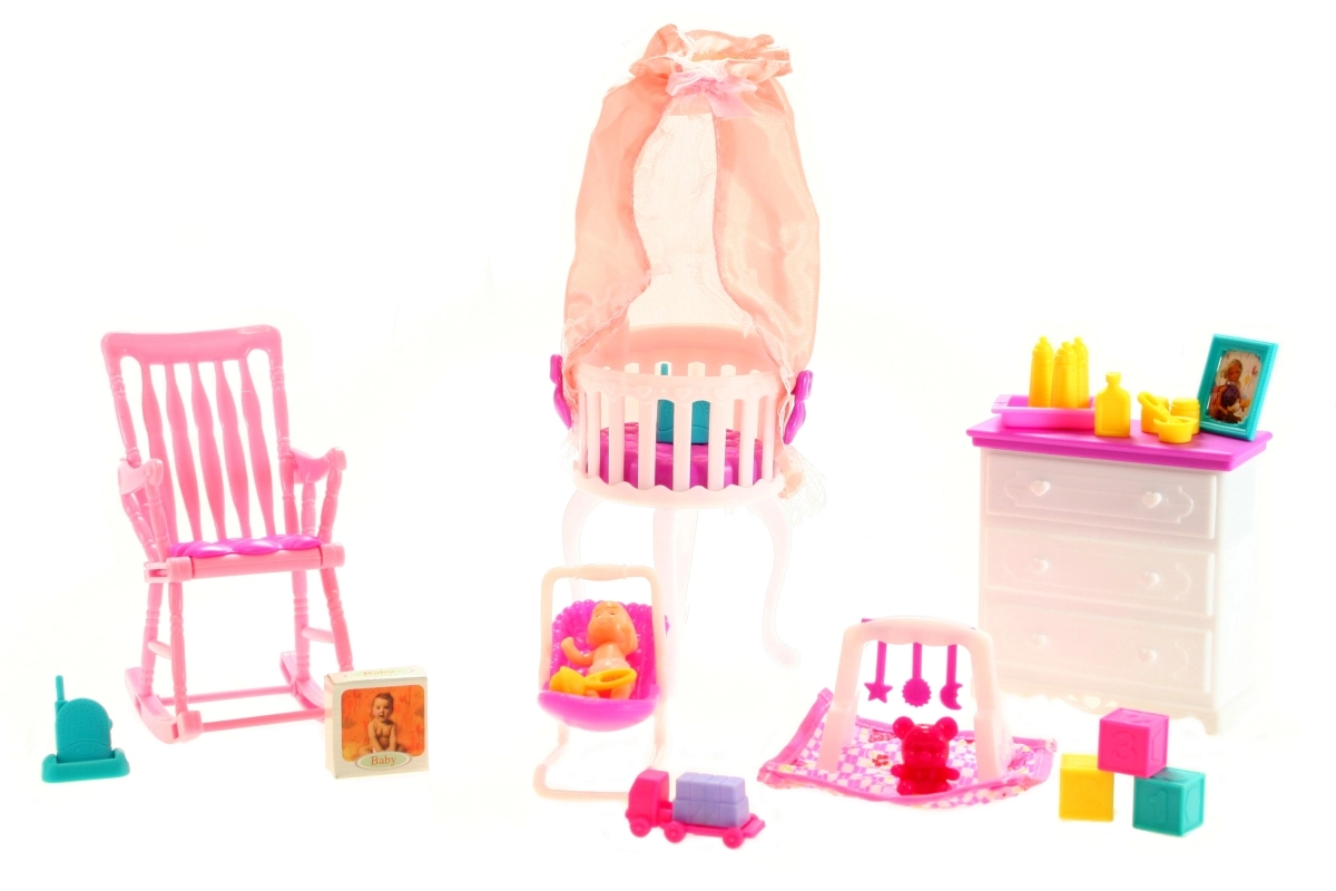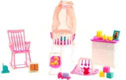 Този богато оборудван комплект превръща всяка игра в реалистично изживяване. Децата могат да обособят собствен кът за бебето, да подреждат дребни вещи в скрина, да слагат бебето в легълцето с балдахин и да се люлеят в стилния стол. Комплектът отлично подпомага креативната игра, развитието на фината моторика и ролевите игри.