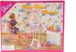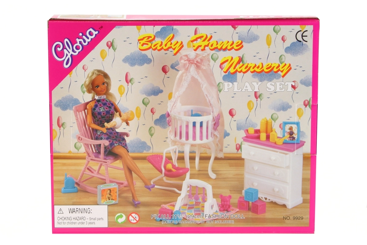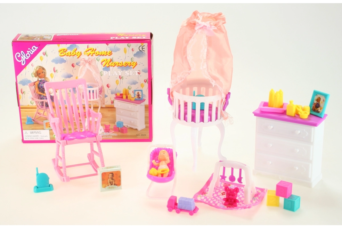 Пълният комплект за бебе от марката Glorie носи всичко, от което детската стая се нуждае за игра с кукли. В него ще откриете скрин с чекмедже, легълце с балдахин, шезлонг, люлеещ се стол, аксесоари за грижа за бебе и самото бебе. Идеален за деца от 3 години за развитие на въображението и грижовните умения.