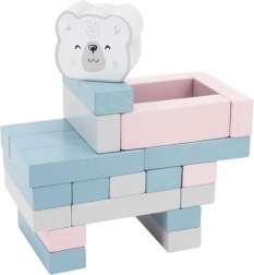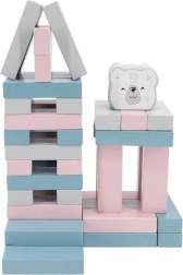 Комплектът съдържа 56 дървени блока и 2 зара за множество варианти на игра.