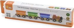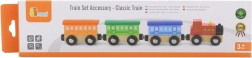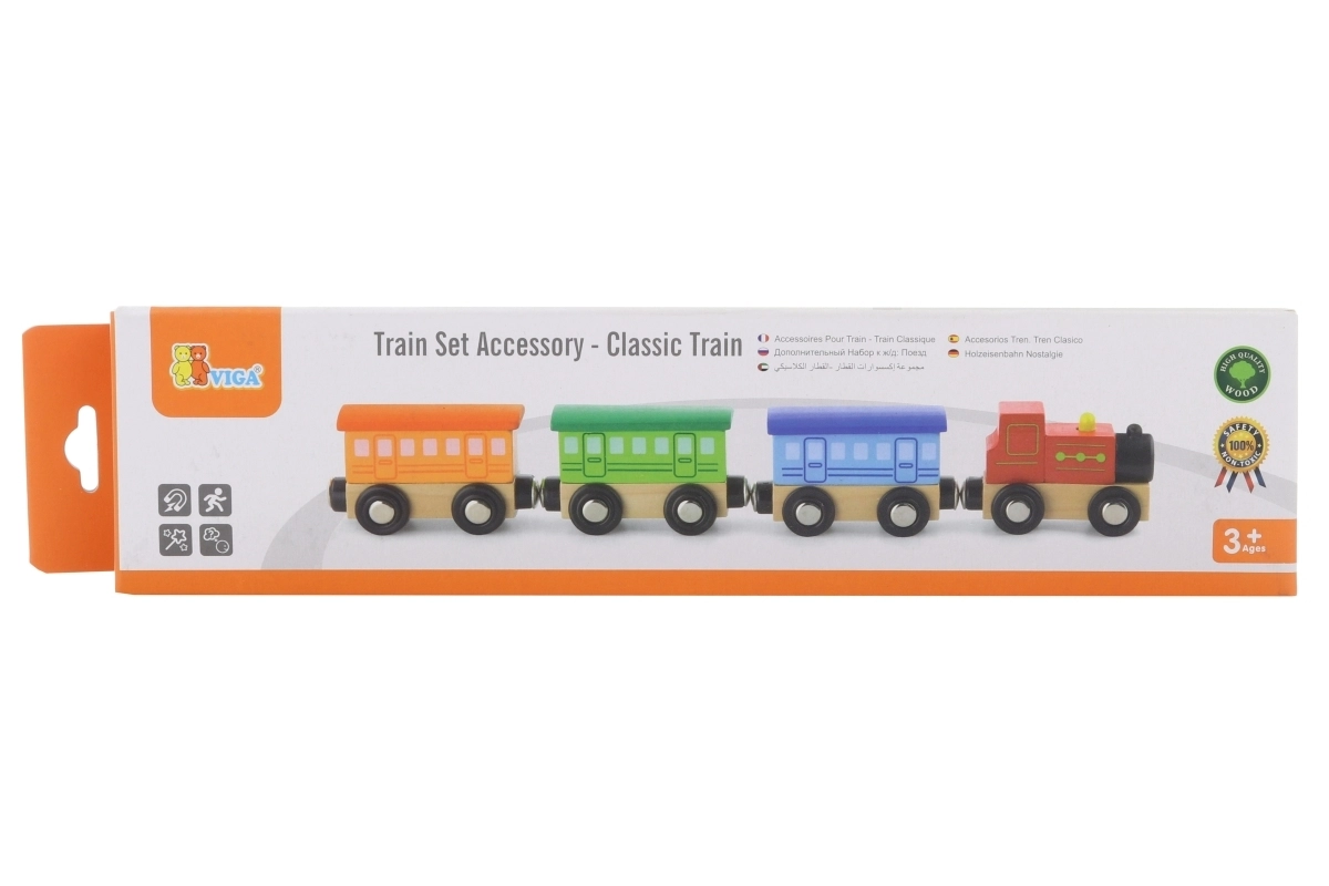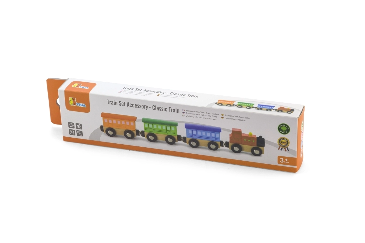 Дървеният комплект Класически влакче съдържа 4 части, които са свързани с магнити. Тази играчка е проектирана от реномирания производител на дървени играчки Viga Toys. Комплектът може да се използва като самостоятелна играчка или като допълнение към други железопътни писти, конструктори и комплекти.