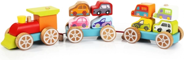 Този цветен дървен пъзел съдържа 14 елемента, от които децата могат да сглобят влакче с два вагона и осем колички. Те не само играят с отделните части, но и развиват своите сенсомоторни способности, логическо мислене и креативност.