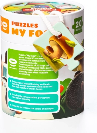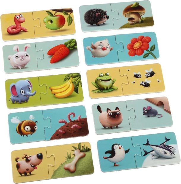Открийте забавен образователен комплект, в който децата съчетават животните с любимата им храна. Опаковката съдържа 20 здрави картонени части, образуващи 10 големи двойки. Играта развива логическо мислене, фината моторика, концентрацията и свързването на причинно-следствени връзки по забавен и игрови начин. Идеално за деца от 2 години.