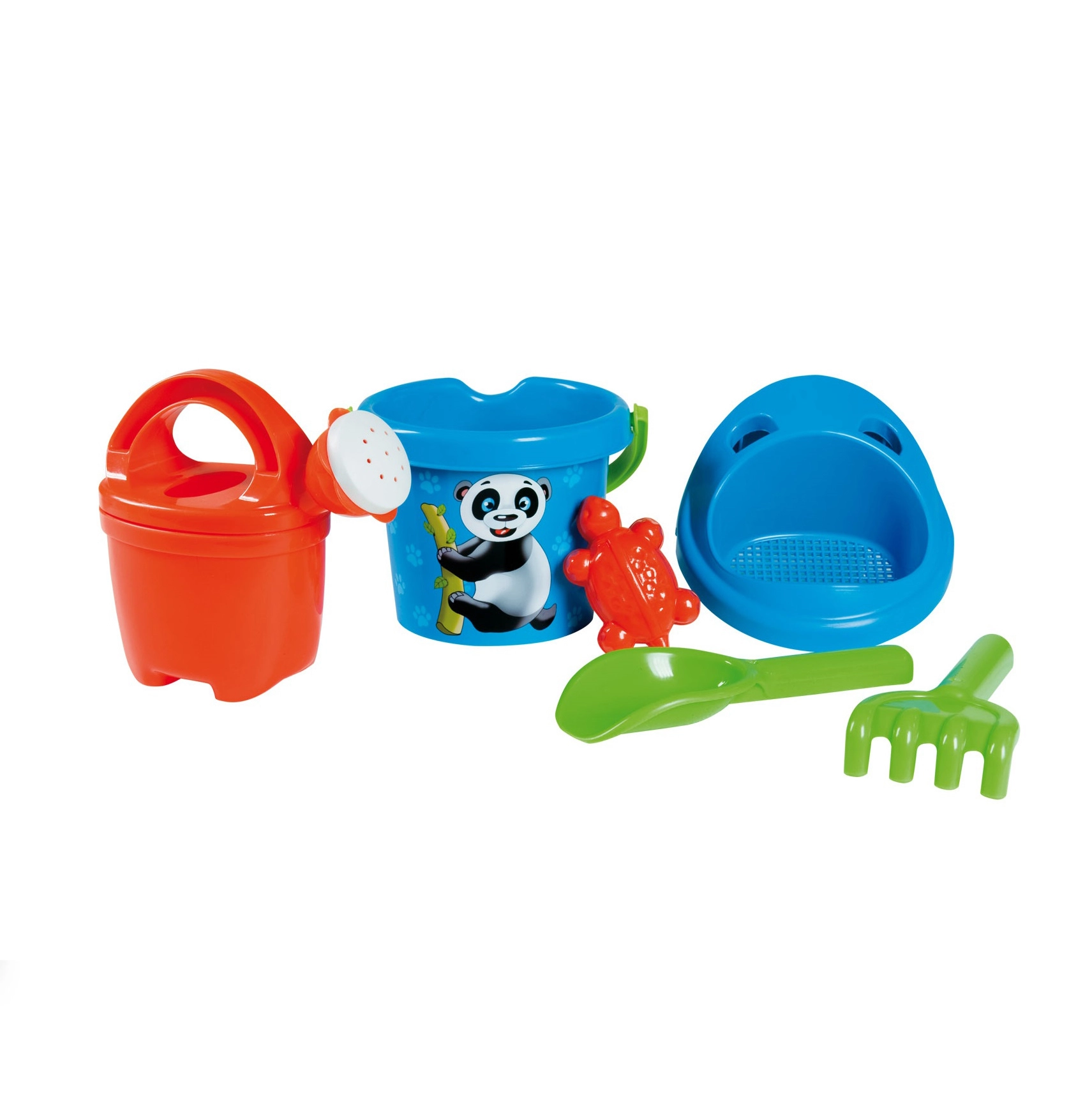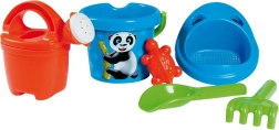Очарователен 6-частов комплект за пясък ANDRONI с мотив панда ще зарадва малките строители на плажа и в пясъчника. Произведен е в Италия от качествена пластмаса, безопасен е от 12-месечна възраст и съдържа всичко необходимо: кофичка (Ø 13 cm, височина 11 cm), лейка 0,5 l, сито, лопатка, греблички и формичка във формата на костенурка.