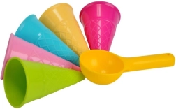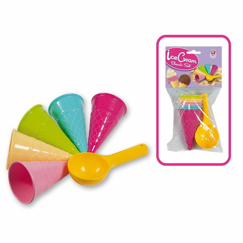Androni формички за пясък Сладолед са идеални за малките любители на пясъка и сладоледа. Този шестчастов комплект предлага пет фунийки и практична лъжичка за топки, което позволява на децата да създават свои собствени пясъчни сладоледени деликатеси.