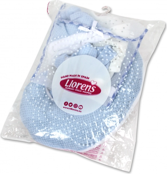 Комплектът е произведен в Испания и идва в подаръчна декоративна мрежа с картонена закачалка, заедно с възглавницата, поставени в защитна опаковка – идеален за подарък. Благодарение на точната кройка пасва на куклите LLORENS 40–42 см и улеснява честото преобличане при ежедневна игра.