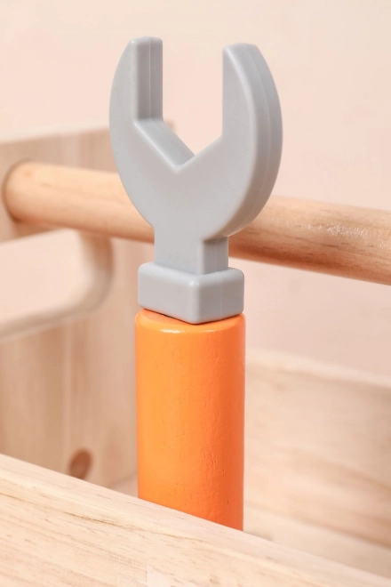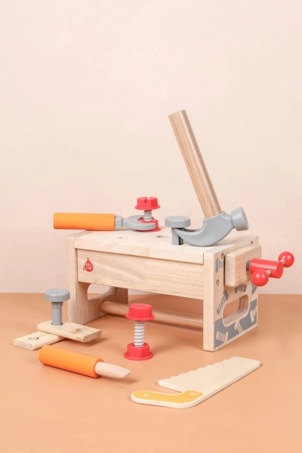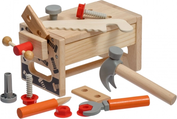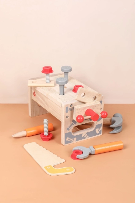 Част от комплекта е разнообразен детски инструментариум: чук, трион, отвертка, ключ, винтове и гайки, менгеме и гладки дървени елементи с отвори. Всичко има своето място, така че децата се учат на ред и основни техники за работа със свързващи елементи. Играта подпомага креативните строителни игри, координацията око–ръка и търпението.