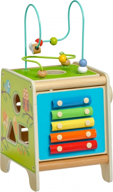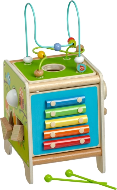 Това цветно дървено активно кубче носи на децата часове смислена игра. Горният мъниест лабиринт може да се извади и обърне навътре за лесно прибиране. По страничните стени децата ще открият ксилофон с палки, сортер с двуделни въртящи се геометрични форми, моторен лабиринт, въртящо се колелце, ротационни елементи и забавна игра с преместване на колче в каналче.