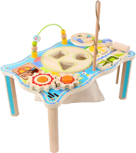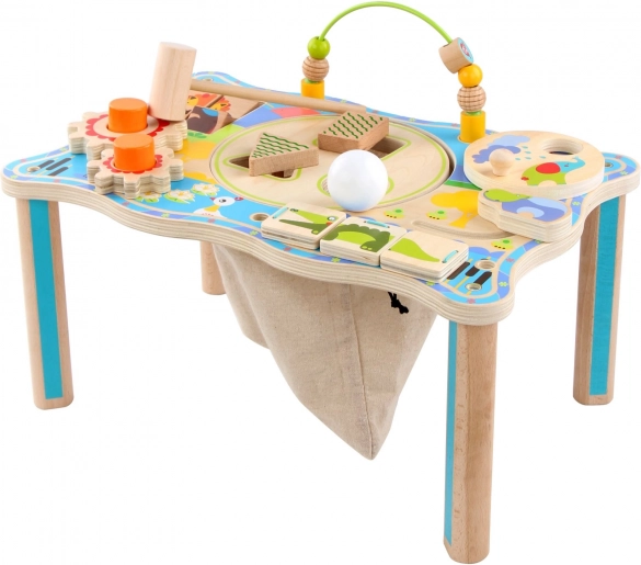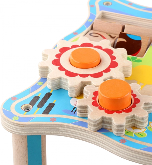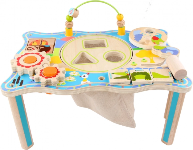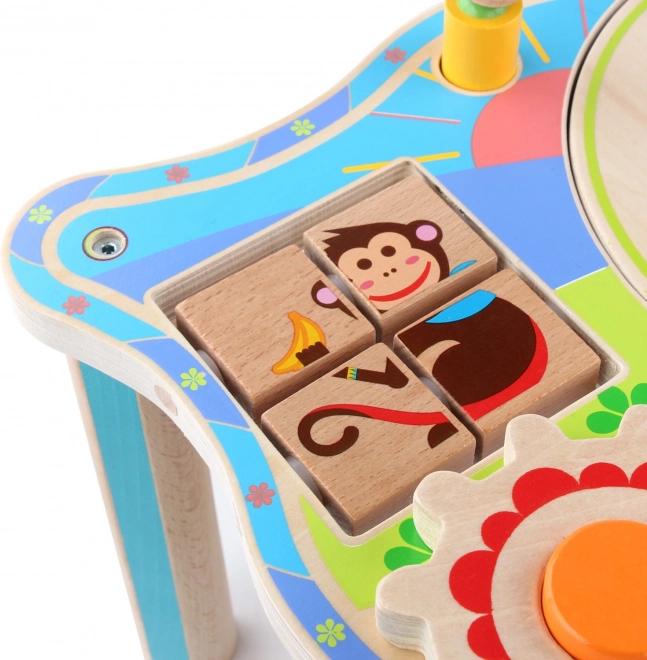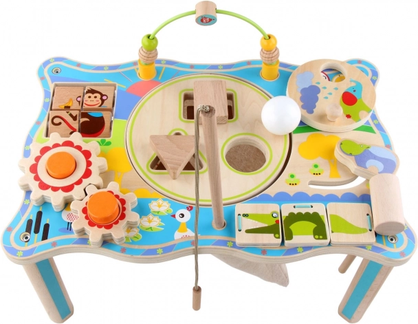 Дървената масичка с джунглови мотиви съчетава забавление и учене и подпомага фината моторика, координацията око–ръка и логическото мислене. Децата могат да въртят зъбните колела, да преместват мънистата по релсата, да тренират сила и концентрация с чуковката и да упражняват разпознаване на форми благодарение на сортера. В центъра има ленена торбичка за уловените рибки и игровите елементи, която поддържа игралната площ подредена.