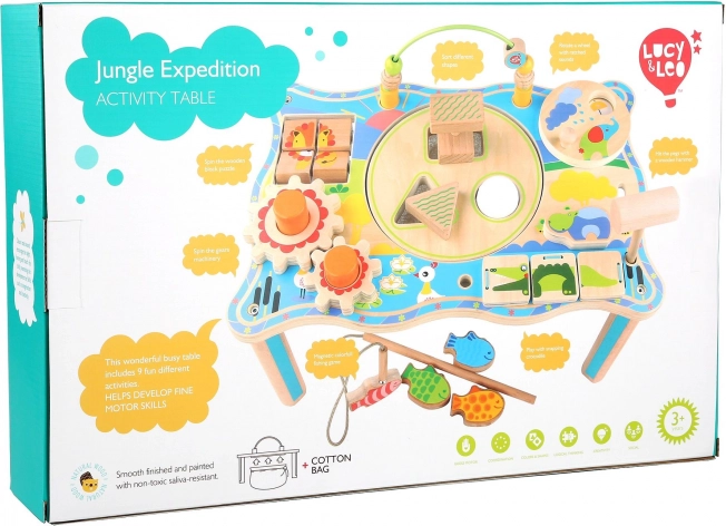 Открийте забавлението и ученето в едно с детската масичка LUCY & LEO – Експедиция в джунглата. Тази качествена дървена многофункционална масичка предлага пъстра гама от активности за развитие на детските умения: магнитен риболов, зъбни колела, лабиринт с топчета, чуковка и сортер за форми. Здравото изпълнение, игривият дизайн и практичната ленена торбичка за събиране на частите осигуряват дълги часове смислена игра.