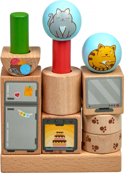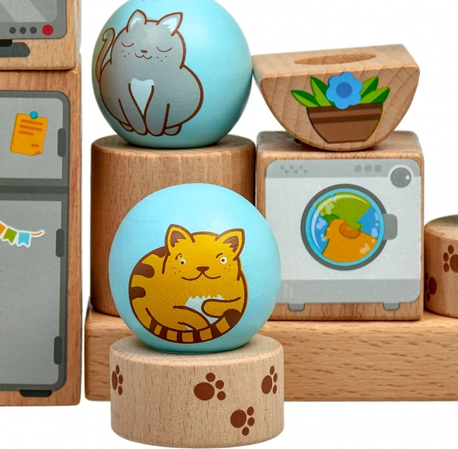 - Здрави дървени елементи с весели илюстрации на котки и домашен интериор