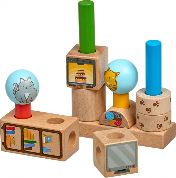 Дървеният пъзел Игриви котки носи забавно учене чрез подреждане на цветни форми върху основа с колчета. Благодарение на 24-те карти със задачи децата изпробват различни подредби и се учат да възприемат пространство, форми и цветове. Качествената дървена изработка и безопасните бои гарантират дълъг живот и комфортна игра.