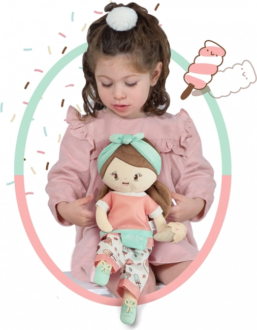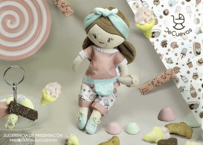 Очарователната плюшена кукла Sweet с размер 36 см е идеалната първа приятелка за най-малките. Изработена е от фин, лъскав плюш, много лека, приятна за гушкане и може да се пере на ръка при 30 °C. Хармоничните цветове с сладоледен мотив и испанският дизайн ще зарадват всяка малка принцеса.